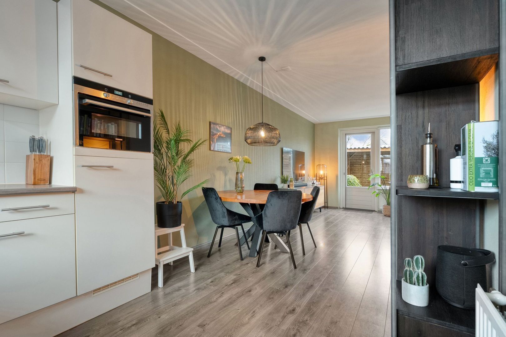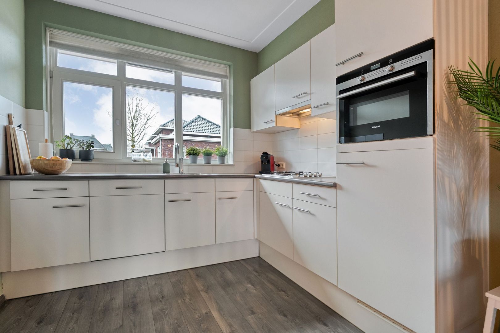 Aan de voorzijde ligt de lichte en verzorgde keuken. Het grote raam in de voorgevel zorgt voor veel daglicht en een prettig uitzicht op de rustige straat. De keuken is uitgerust met een 4-pits gasfornuis, vaatwasser (2023), spoelbak met moderne kraan en voldoende kast- en werkruimte, zodat je hier comfortabel kunt koken.