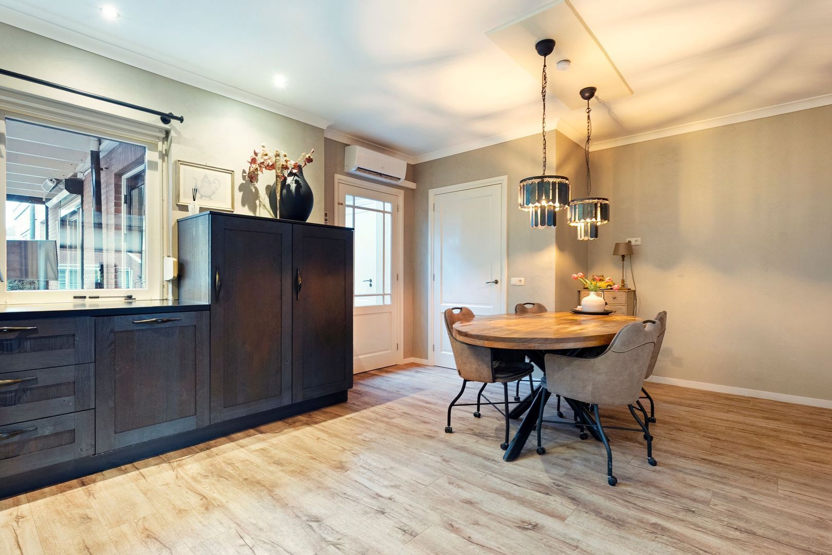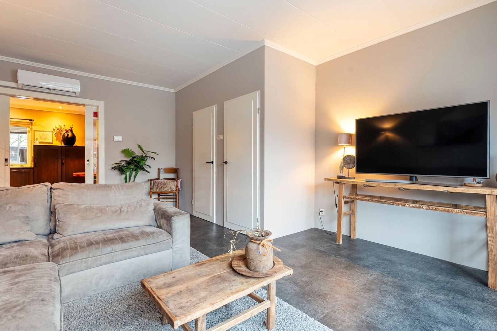 De ruime woonkamer is een lichte en comfortabele leefruimte met grote raampartijen en een moderne afwerking met doorlopende pvc-vloer. De kamer biedt voldoende ruimte voor een royale zit- en eethoek en is voorzien van airconditioning die zowel kan koelen als verwarmen, waardoor het hele jaar door een aangenaam binnenklimaat ontstaat.