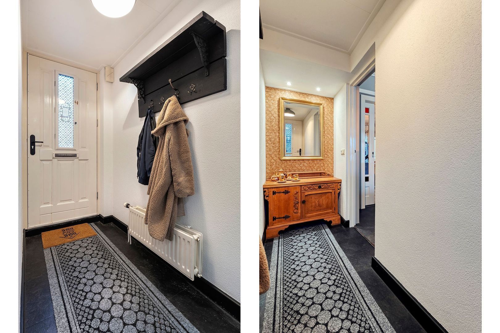 De woning beschikt over zowel een voorentree als een praktische entree aan de zijkant van de woning, waardoor comfort en functionaliteit optimaal samenkomen. Via de voordeur bereikt u de centrale hal, die een warm welkom biedt en directe toegang geeft tot de woonkamer.