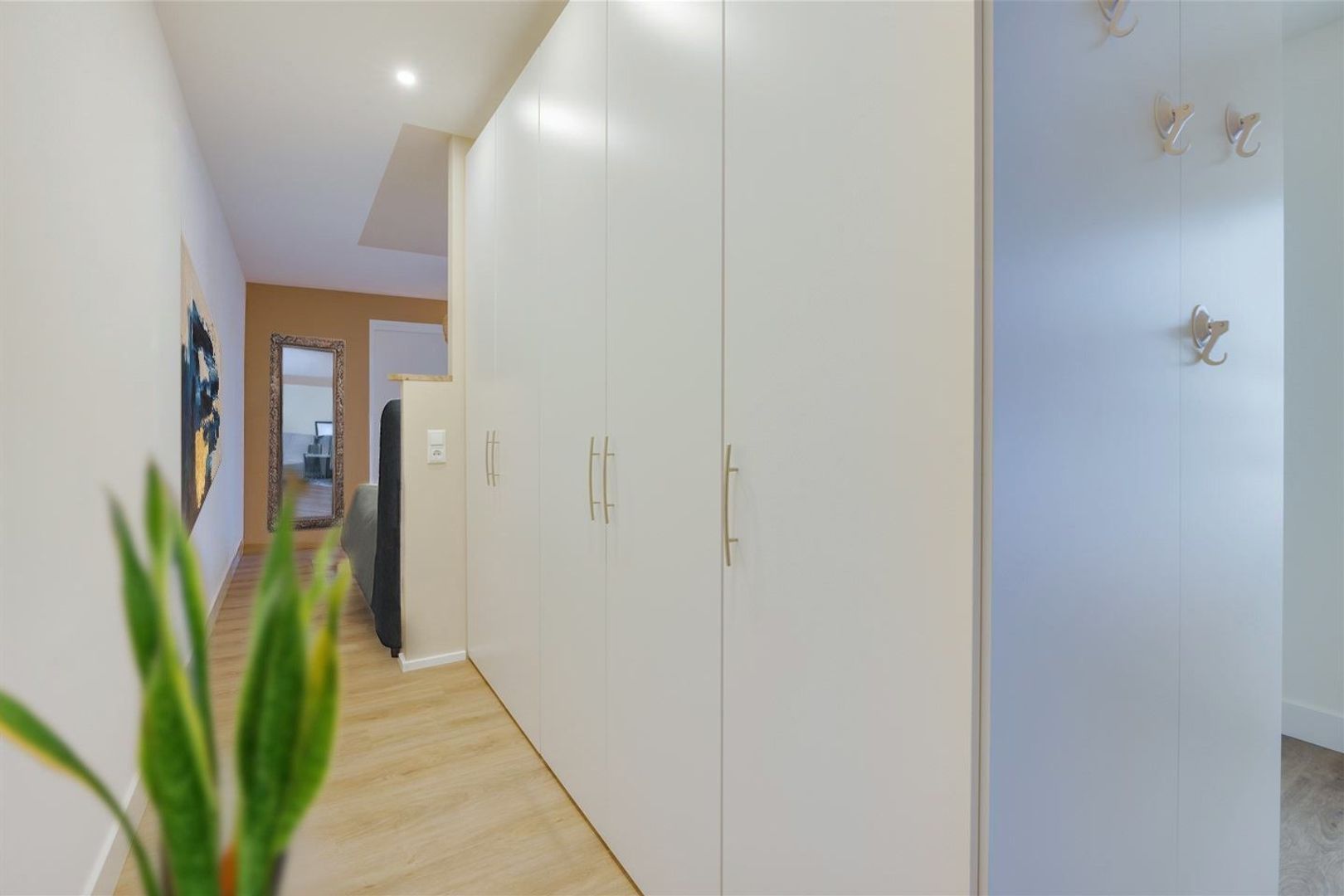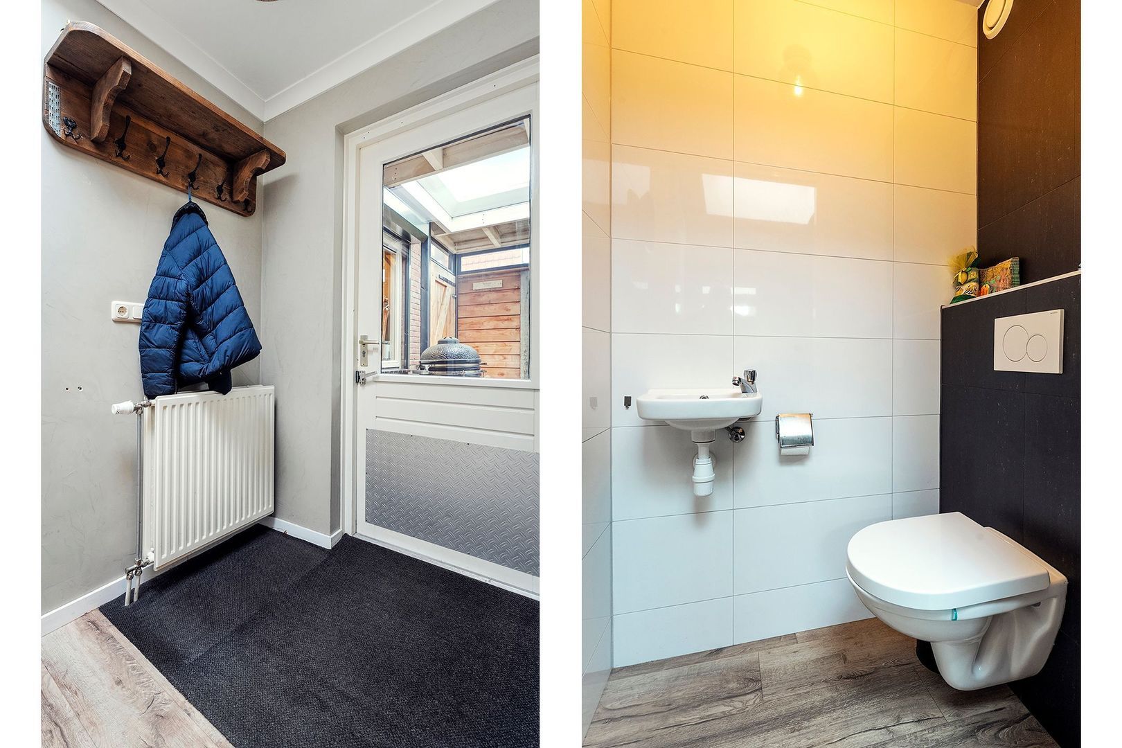 Vanuit de serre bereikt u de achter entree van de woning. Deze hal is praktisch ingericht met een garderoberuimte en een toiletruimte en vormt een centrale schakel tussen de verschillende vertrekken op de begane grond. Vanuit hier heeft u directe toegang tot de keuken en tot de slaapkamer met badkamer op de begane grond, waardoor deze entree bijzonder geschikt is voor dagelijks gebruik en gelijkvloers wonen. De opzet maakt de routing binnen de woning overzichtelijk en comfortabel, terwijl de entree tegelijkertijd een nette en verzorgde eerste indruk geeft bij binnenkomst van de woning.