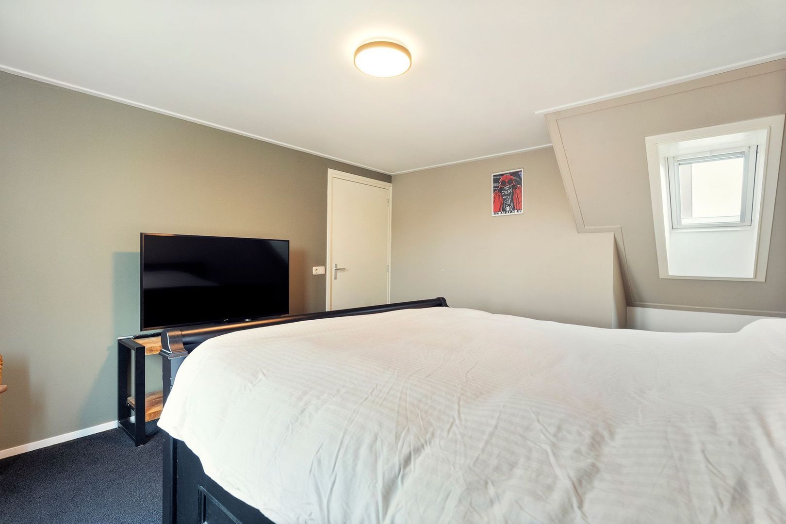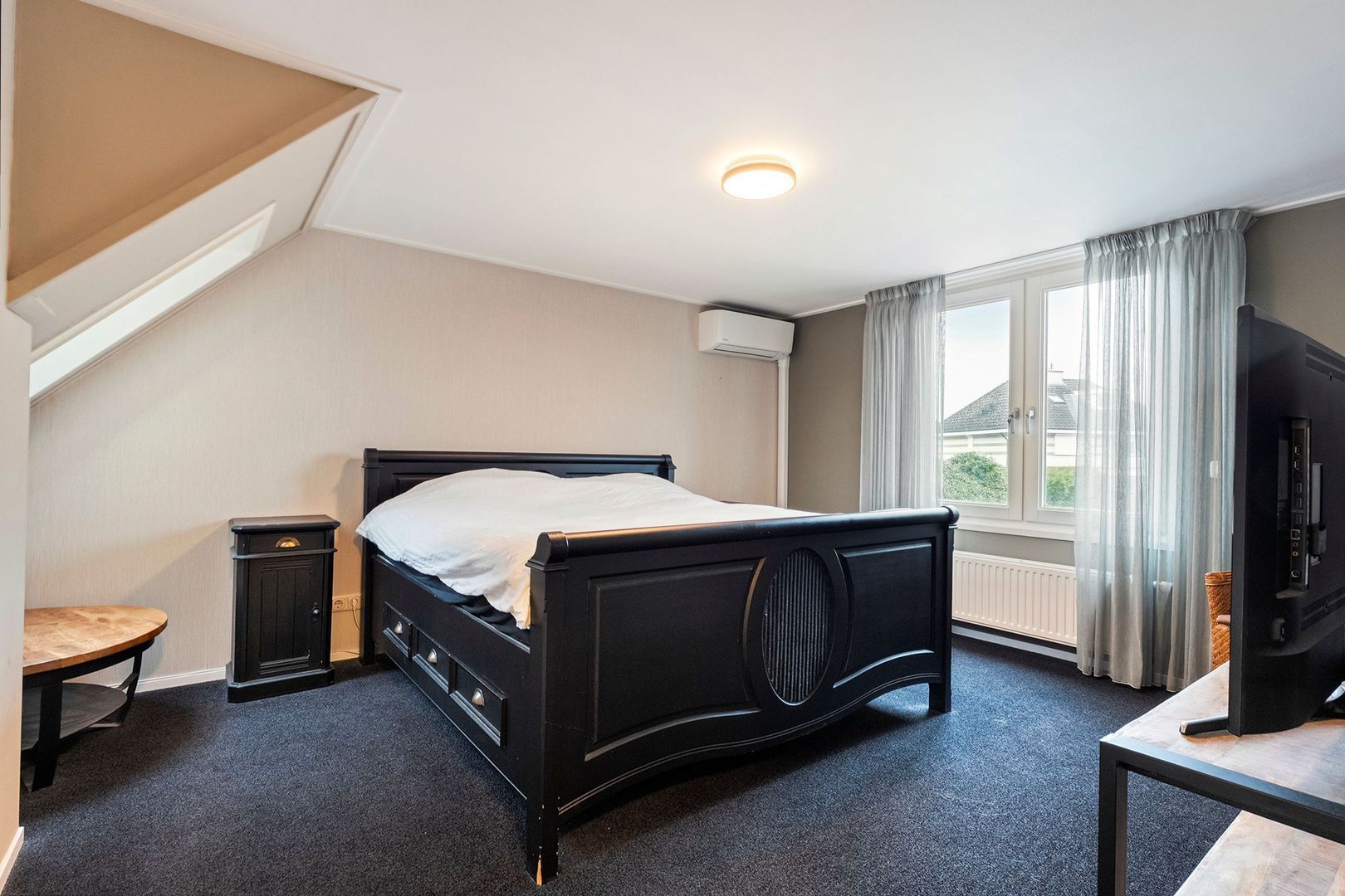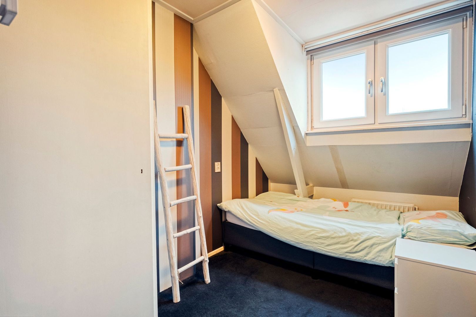 De slaapkamers zijn netjes afgewerkt en voorzien van draai-kiepramen, waardoor ventileren eenvoudig is. Daarnaast zijn twee kamers uitgerust met rolluiken, waarvan de rolluiken in de grootste slaapkamer elektrisch bedienbaar zijn. Deze ruime kamer beschikt bovendien over een dakraam en airconditioning die zowel kan koelen als verwarmen, wat zorgt voor extra comfort gedurende het hele jaar.
