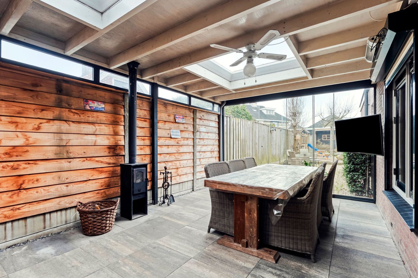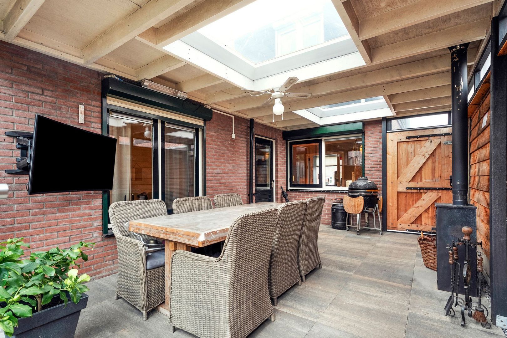 Via de zijentree bereikt u eerst de sfeervolle overkapping/serre, een comfortabele en beschutte buitenruimte die dankzij de glazen schuifwanden het hele jaar door te gebruiken is. Deze ruimte vormt een waardevolle verlenging van de woning en is ingericht met een ruime eettafel, gezellige houtkachel en een TV, waardoor hier zowel in de zomer als in de koelere maanden aangenaam kan worden verbleven. De aanwezige lichtkoepels zorgen voor veel natuurlijk daglicht en versterken het open en ruimtelijke karakter van deze serre, terwijl de directe verbinding met de tuin een fijne overgang tussen binnen en buiten creëert.