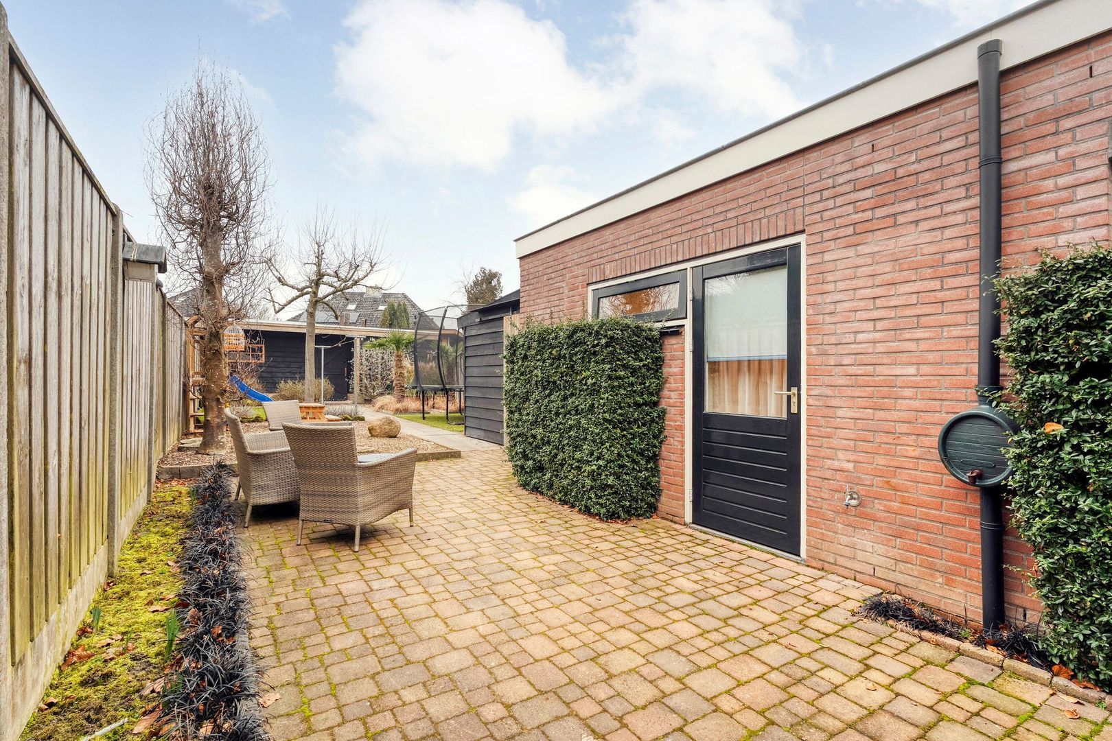 Aangrenzend aan de uitbouw bevindt zich een praktische extra berging, ideaal voor het plaatsen van containers en het opbergen van tuinspullen en overige opslag. Hierdoor blijft de tuin overzichtelijk en netjes ingericht en is alles binnen handbereik.