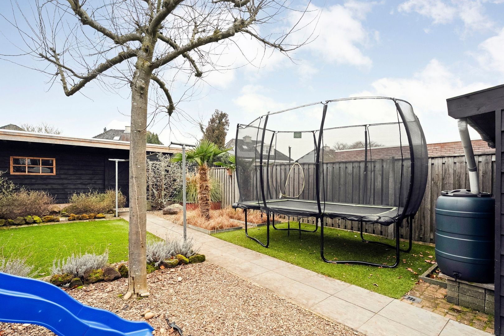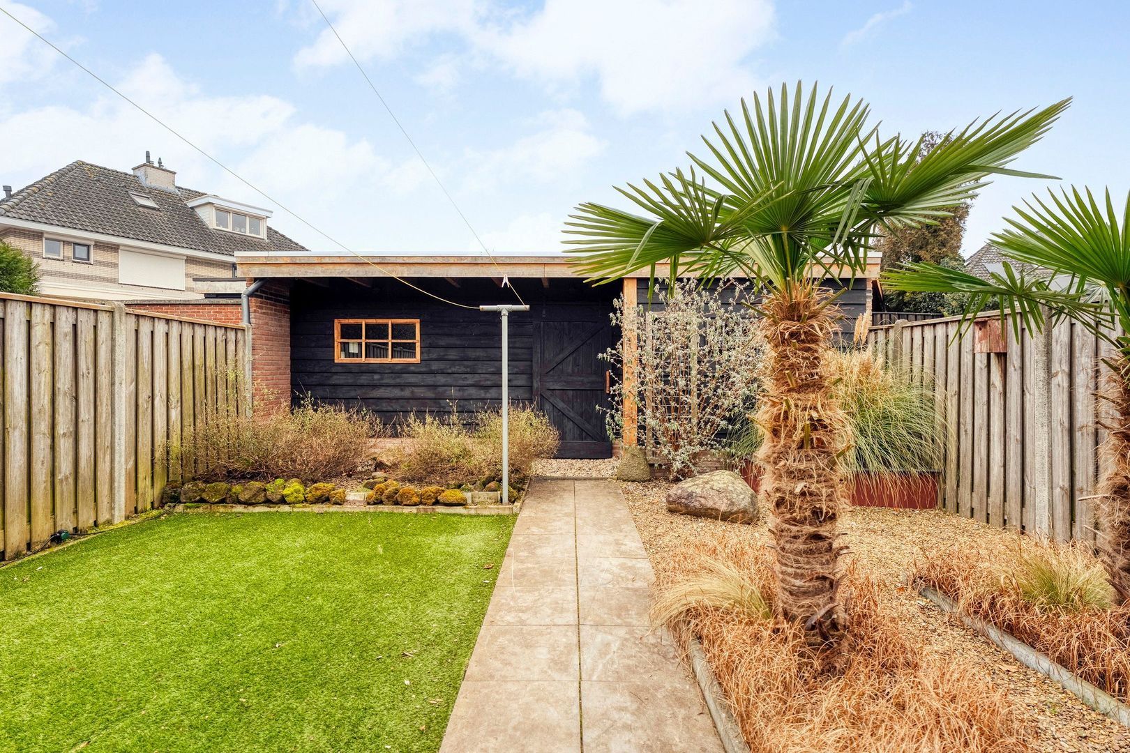 De diepe en fraai aangelegde achtertuin is onderhoudsvriendelijk ingericht en biedt veel privacy dankzij de volwassen beplanting en de aanwezigheid van palmbomen, wat de tuin een groene en sfeervolle uitstraling geeft. Door de royale diepte zijn er meerdere mogelijkheden voor het creëren van verschillende zitplekken, waaronder een comfortabele loungeplek waar u in alle rust kunt genieten van het buitenleven.