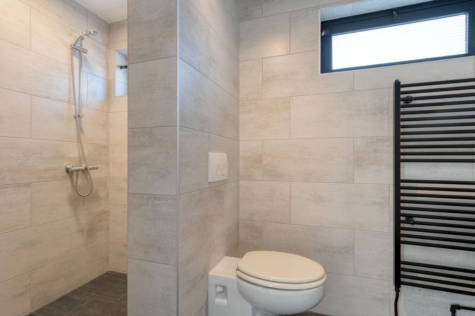 De badkamer is compleet met inloopdouche, hangtoilet, designradiator en een wastafelmeubel.