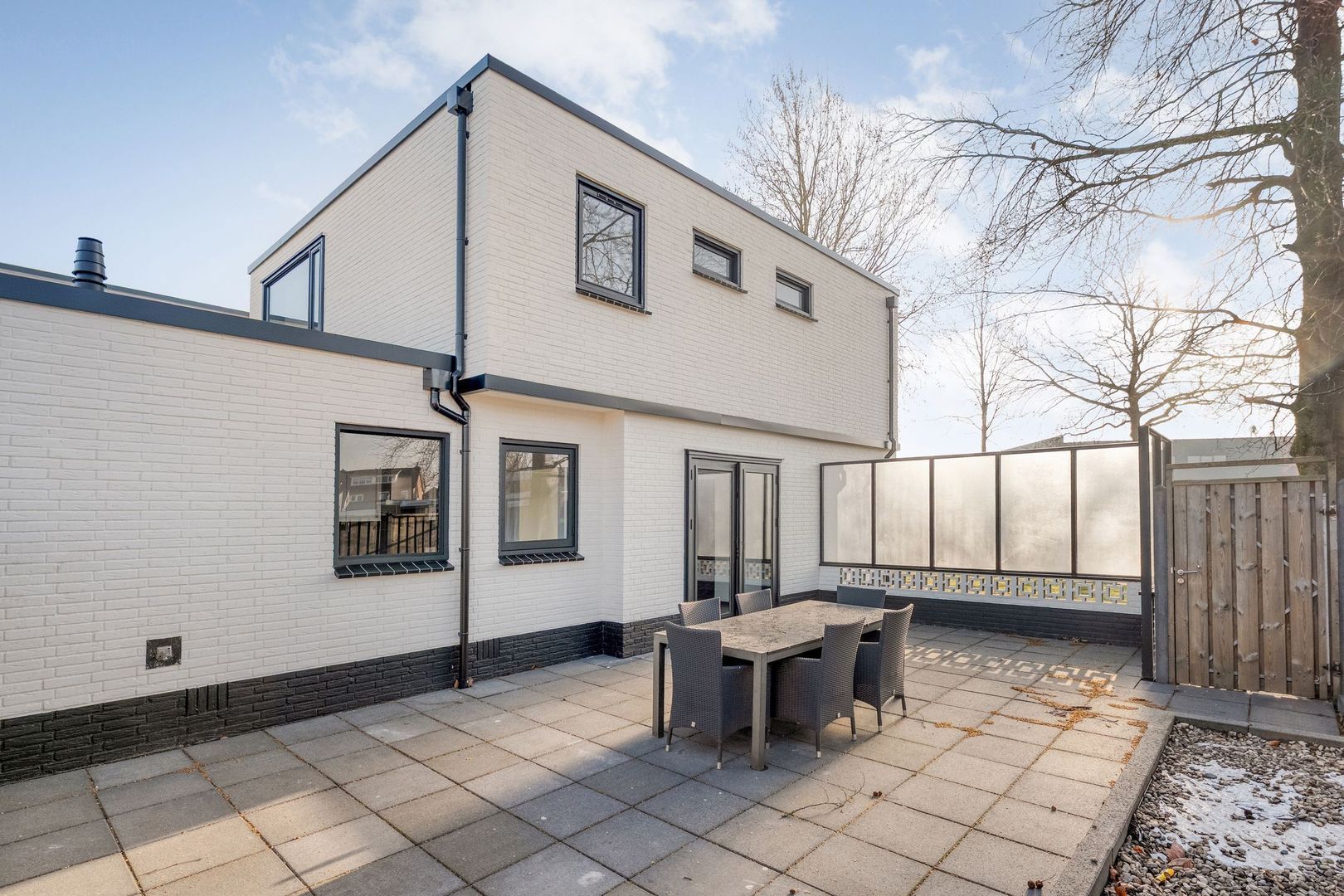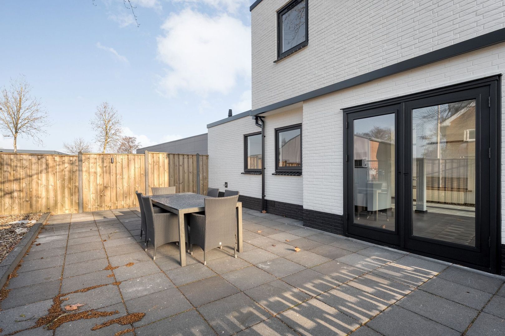 Aansluitend aan de woning bevindt zich de eerste buitenruimte, bereikbaar via openslaande deuren. Deze volledig afgesloten tuin biedt veel privacy en vormt een comfortabele en beschutte plek om buiten te zitten. De tuin is ingericht met een sfeervol terras, een buitenkraan en een eigen ingang en leent zich uitstekend voor ontspanning of het ontvangen van gasten. Door de afgesloten ligging kunnen kinderen hier bovendien veilig spelen, wat bijdraagt aan het wooncomfort.