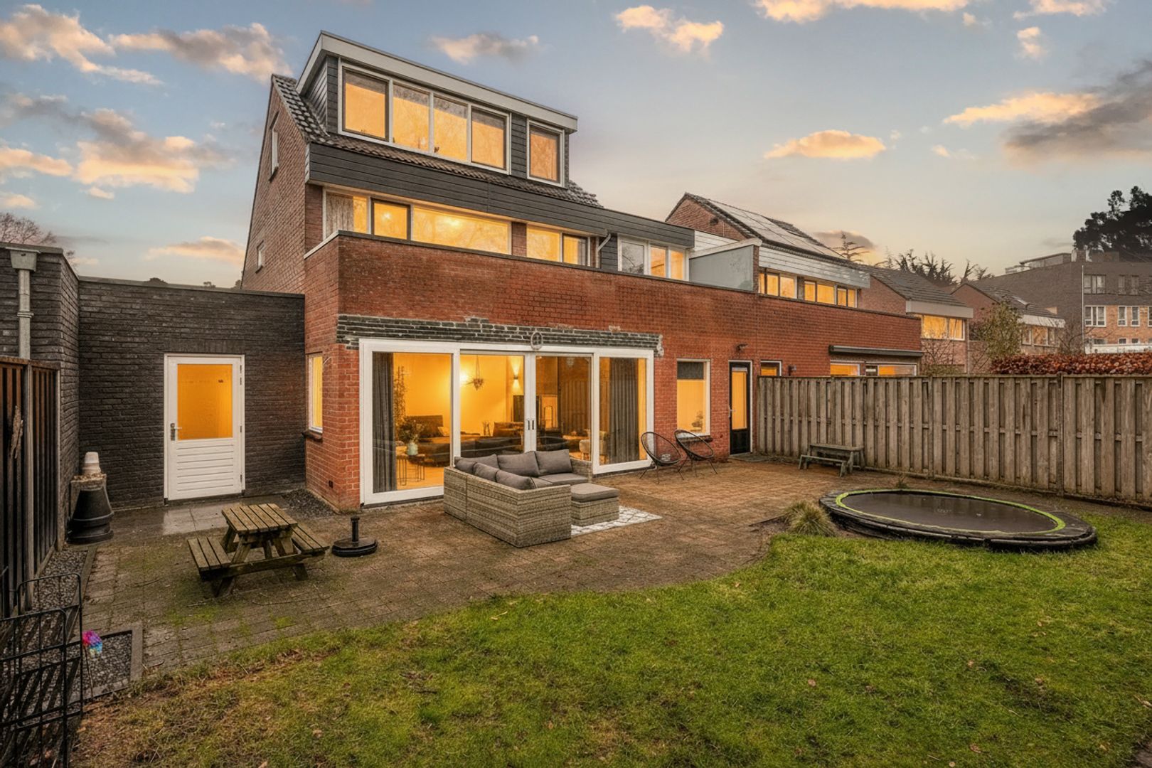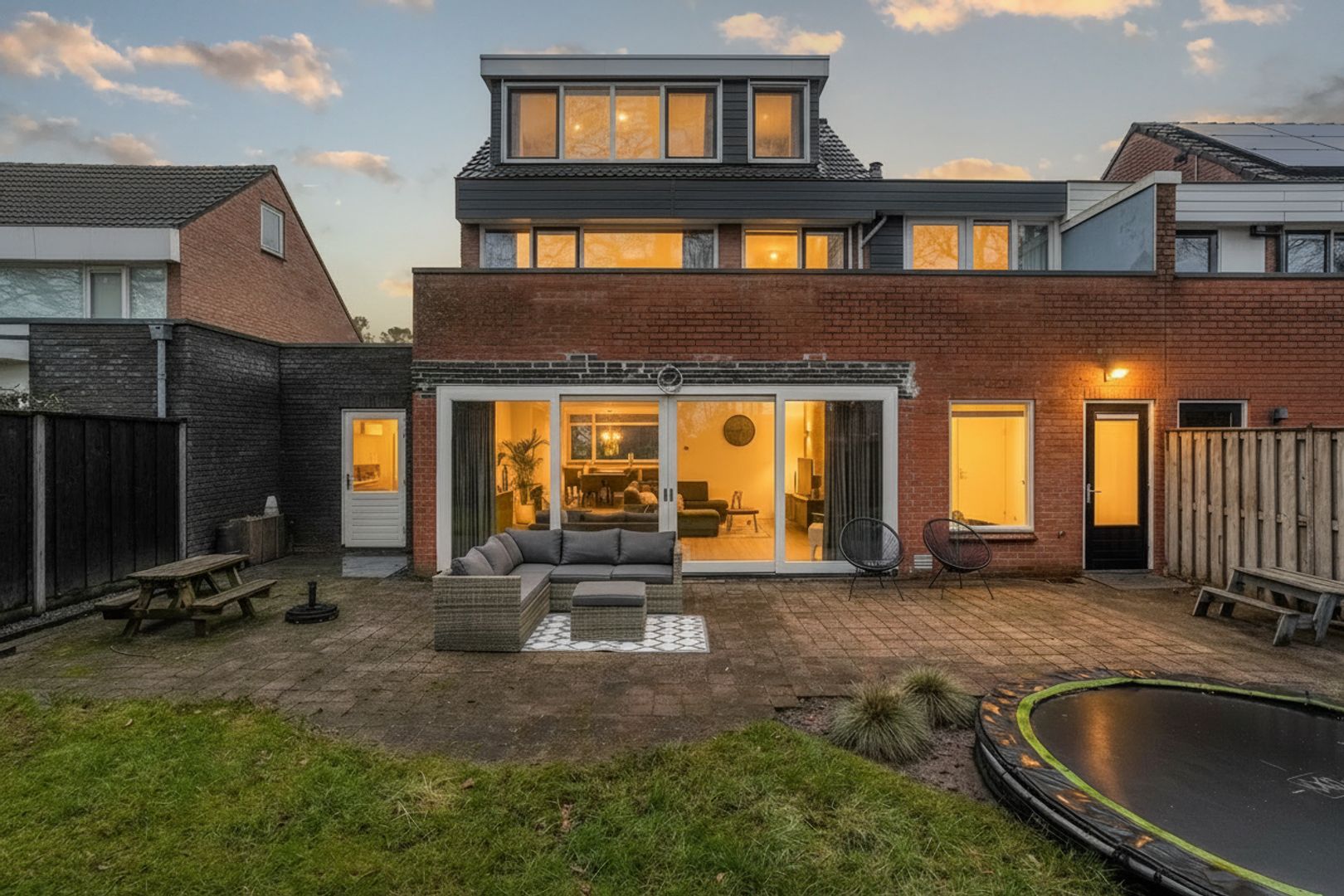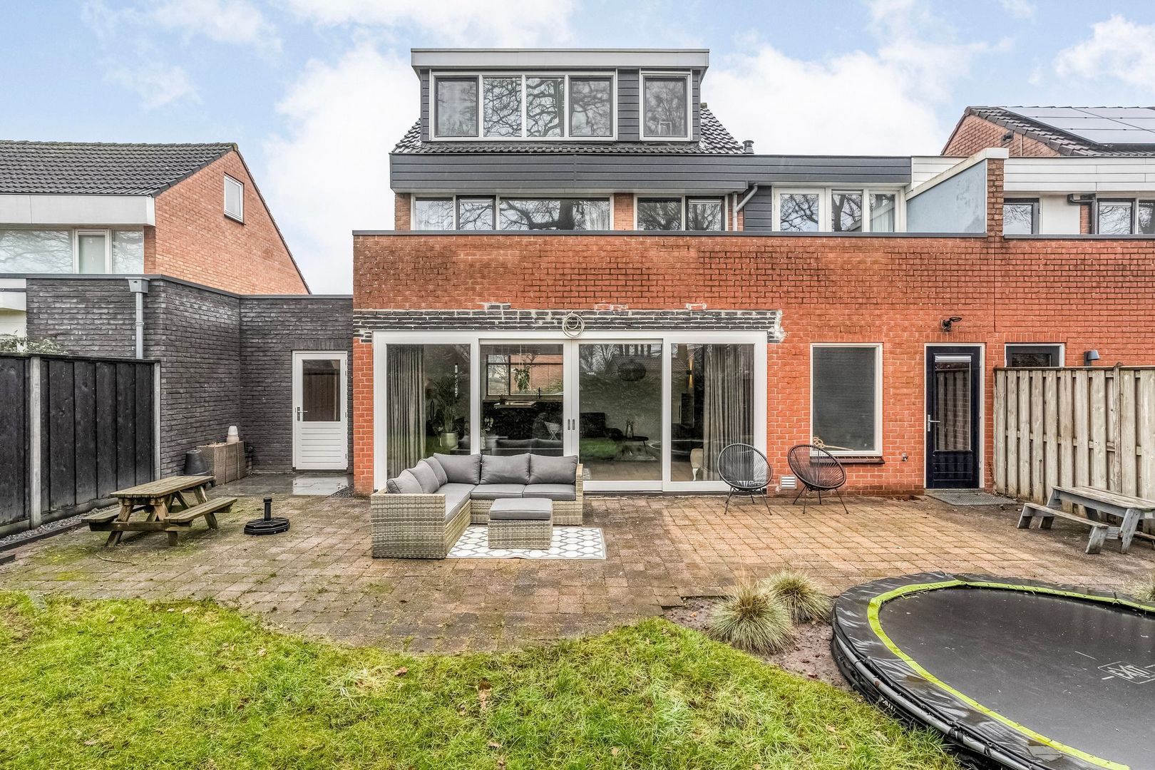 Het terras biedt volop ruimte voor een royale eettafel of loungeset, ideaal voor lange zomeravonden met familie en vrienden. Daarnaast is er voldoende speelruimte aanwezig, waarbij de trampoline een leuke en praktische toevoeging is voor kinderen.