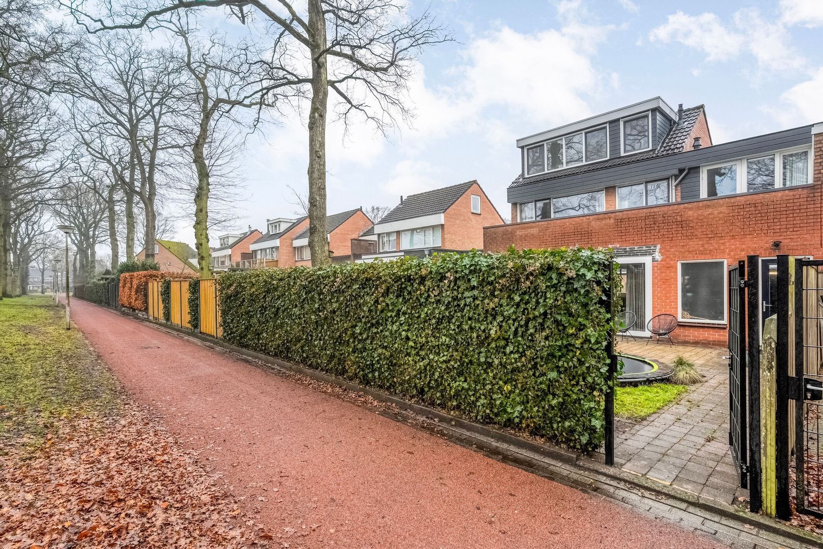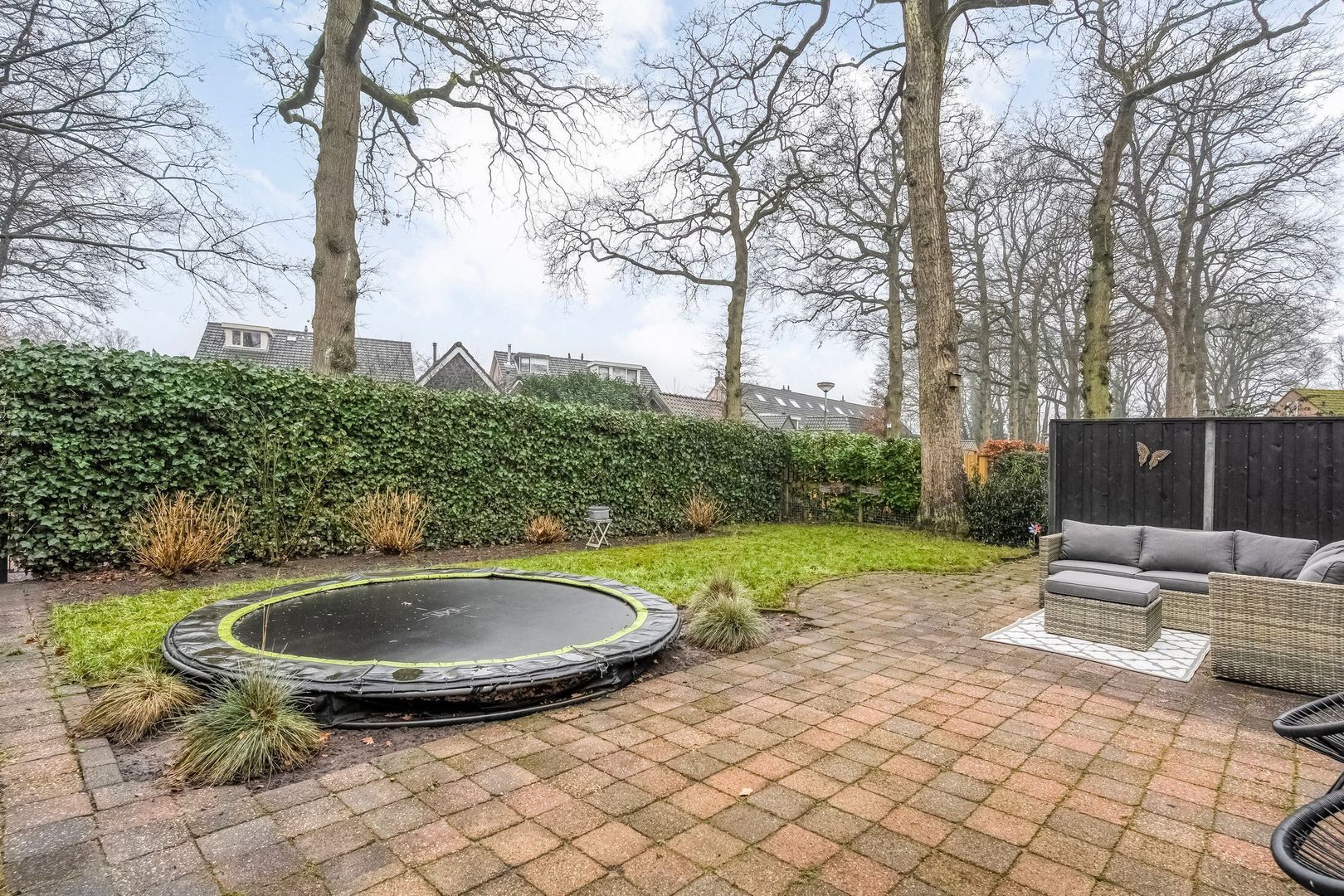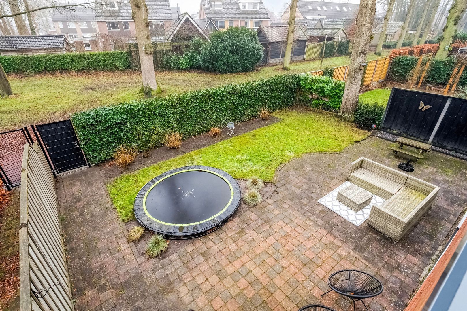 Het terras biedt volop ruimte voor een royale eettafel of loungeset, ideaal voor lange zomeravonden met familie en vrienden. Daarnaast is er voldoende speelruimte aanwezig, waarbij de trampoline een leuke en praktische toevoeging is voor kinderen.