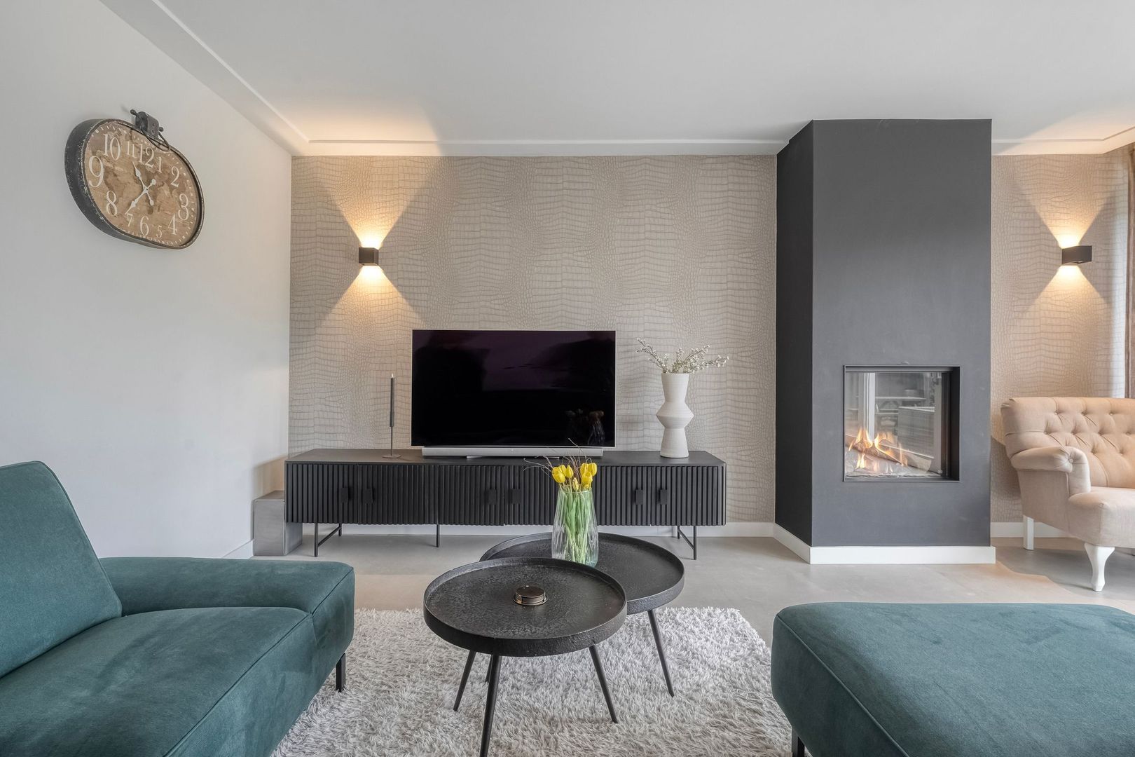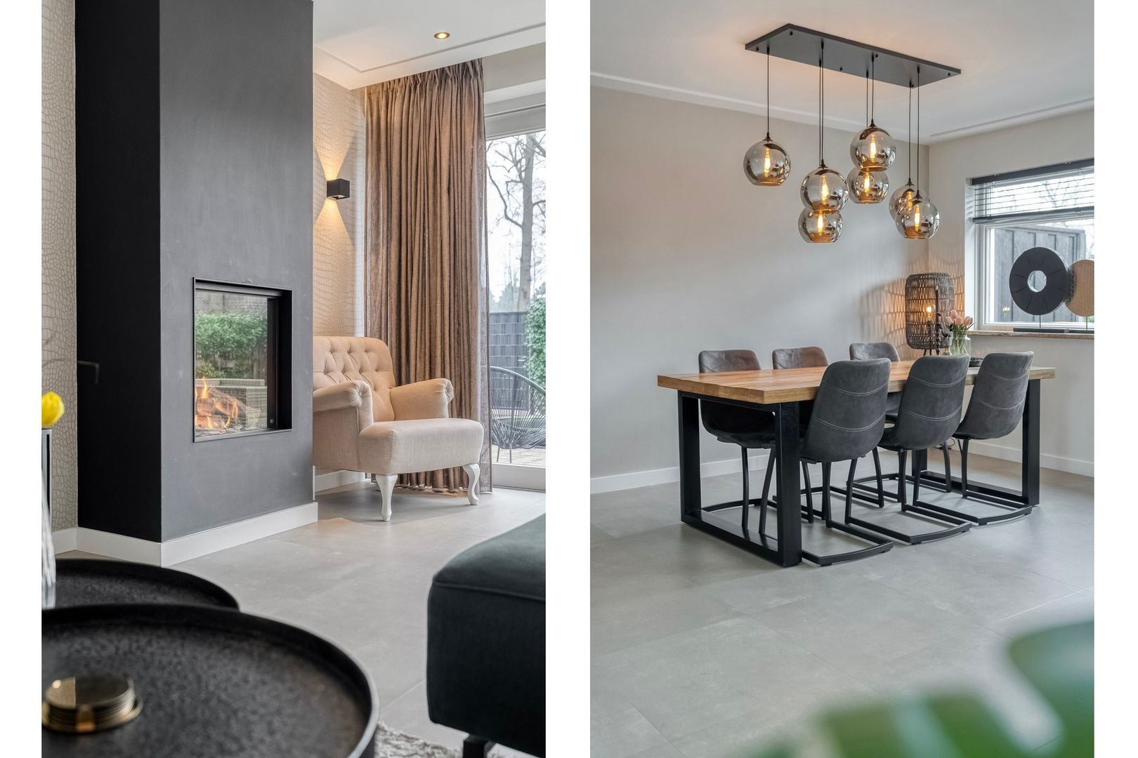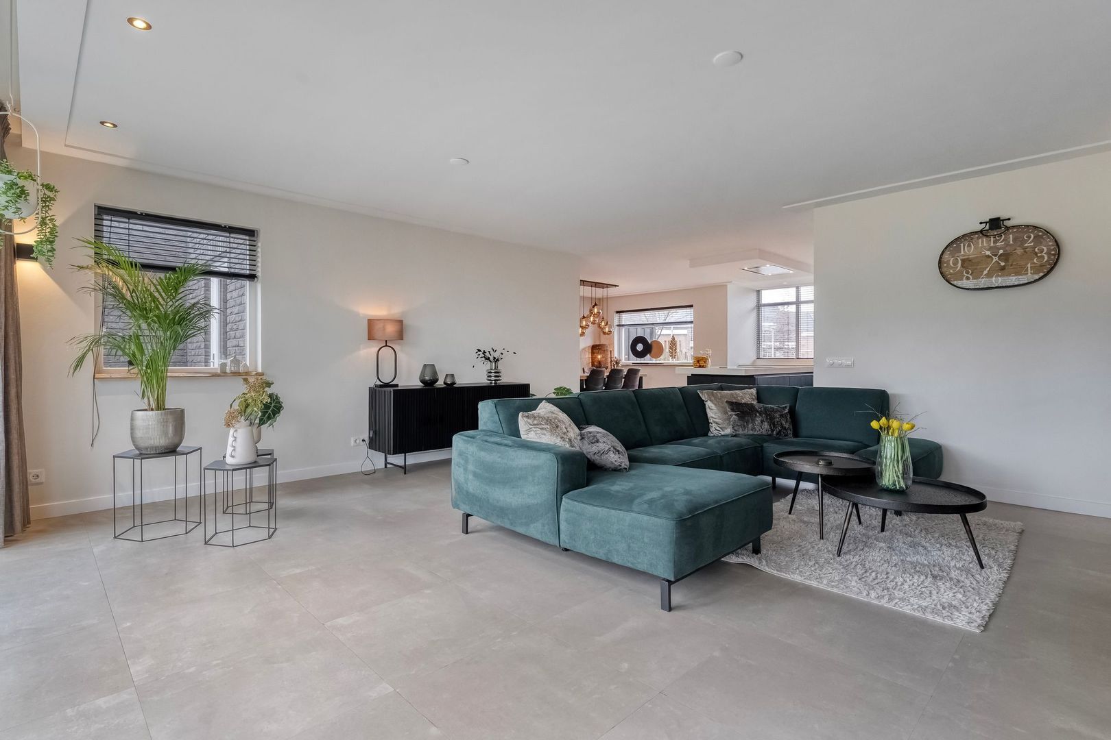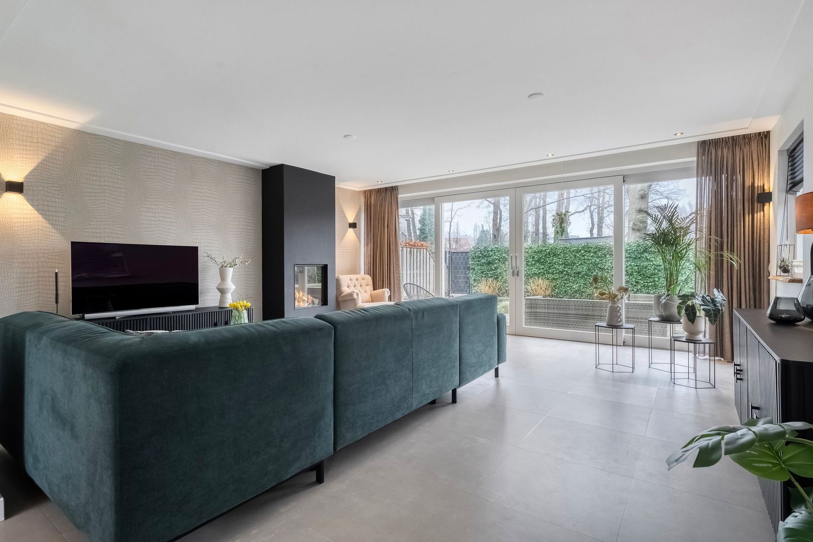 De woonkamer is bijzonder ruim dankzij de uitbouw. De schuifpui over de volledige breedte aan de achterzijde zorgt voor veel daglicht en een directe verbinding met de tuin. Inbouwspots geven het plafond een strakke uitstraling en de gaskachel zorgt voor extra sfeer. Er is volop ruimte voor een royale zithoek en een grote eettafel.