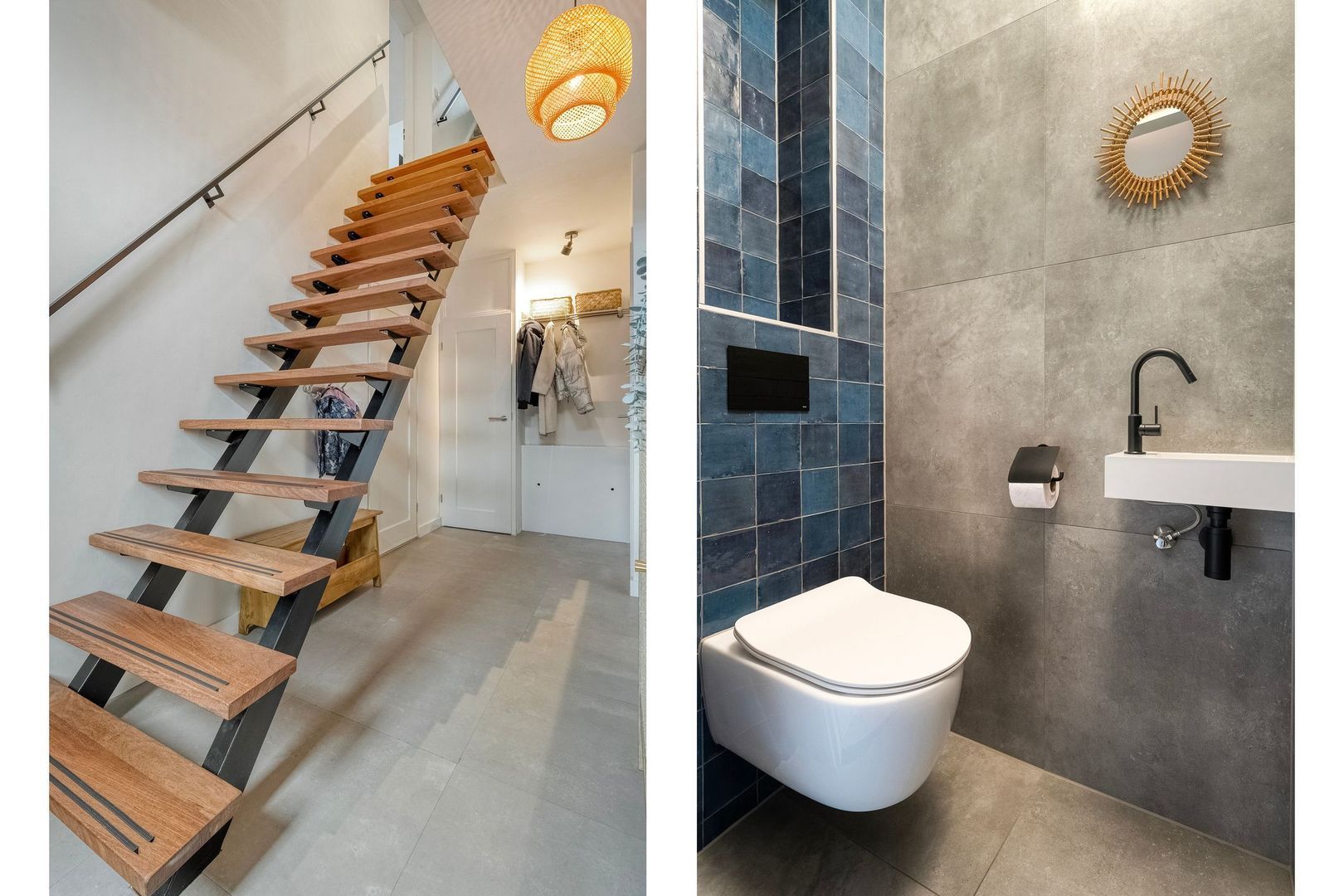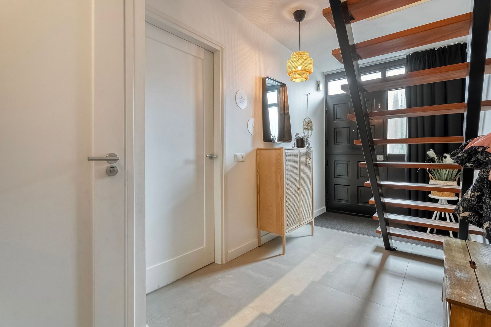 Daarnaast treft u hier de verdeler van de vloerverwarming en een modern hangtoilet met fontein en nis. De hardhouten steektrap leidt naar de eerste verdieping en vanuit de hal heeft u directe toegang tot zowel de royale leefruimte als de garage, wat zorgt voor een praktische en prettige indeling van de woning.