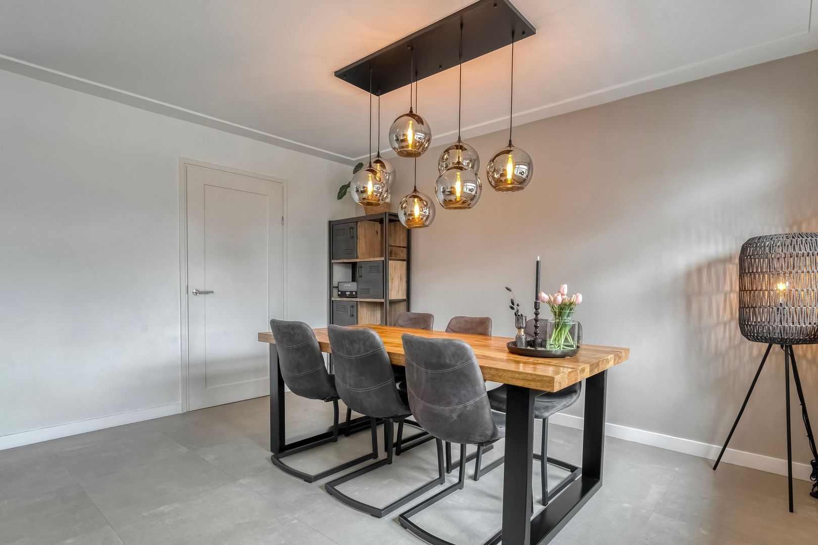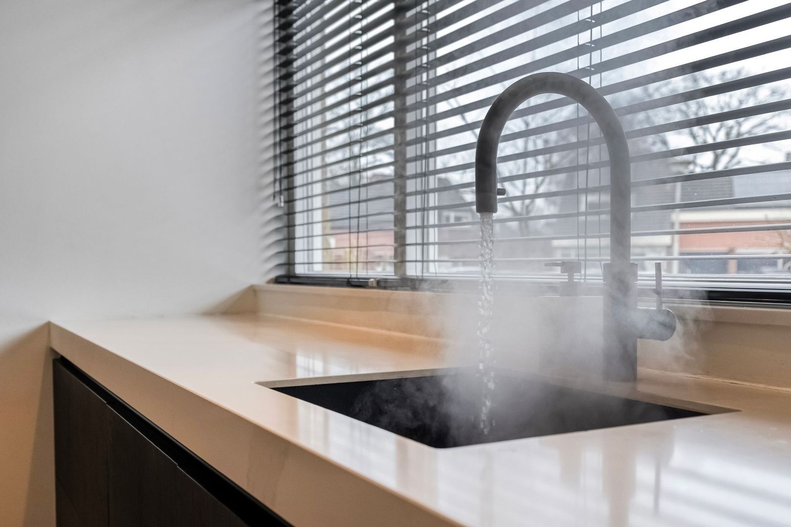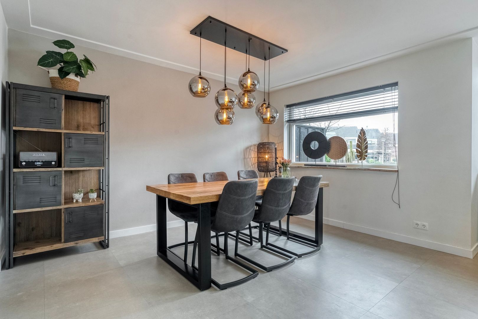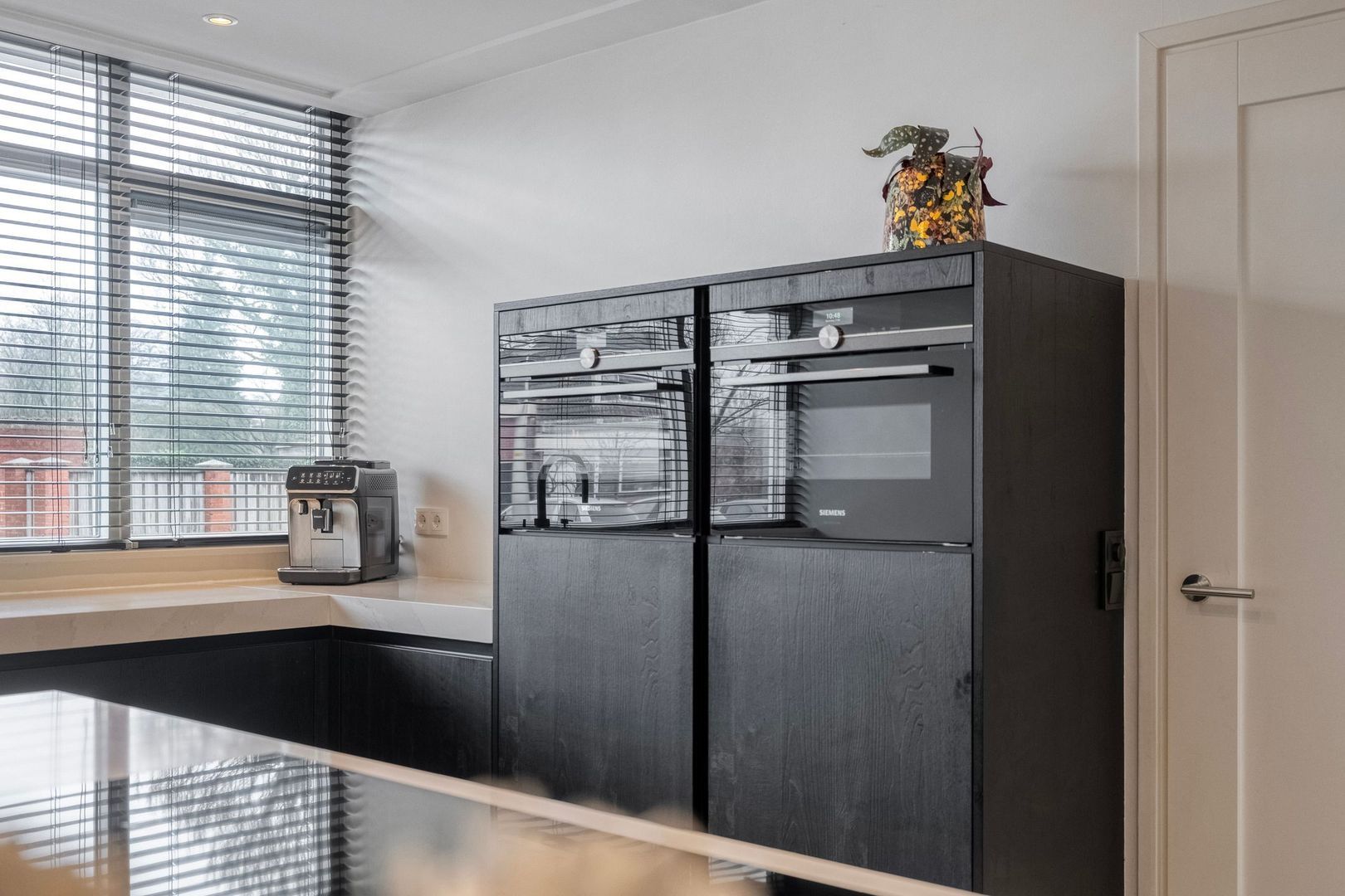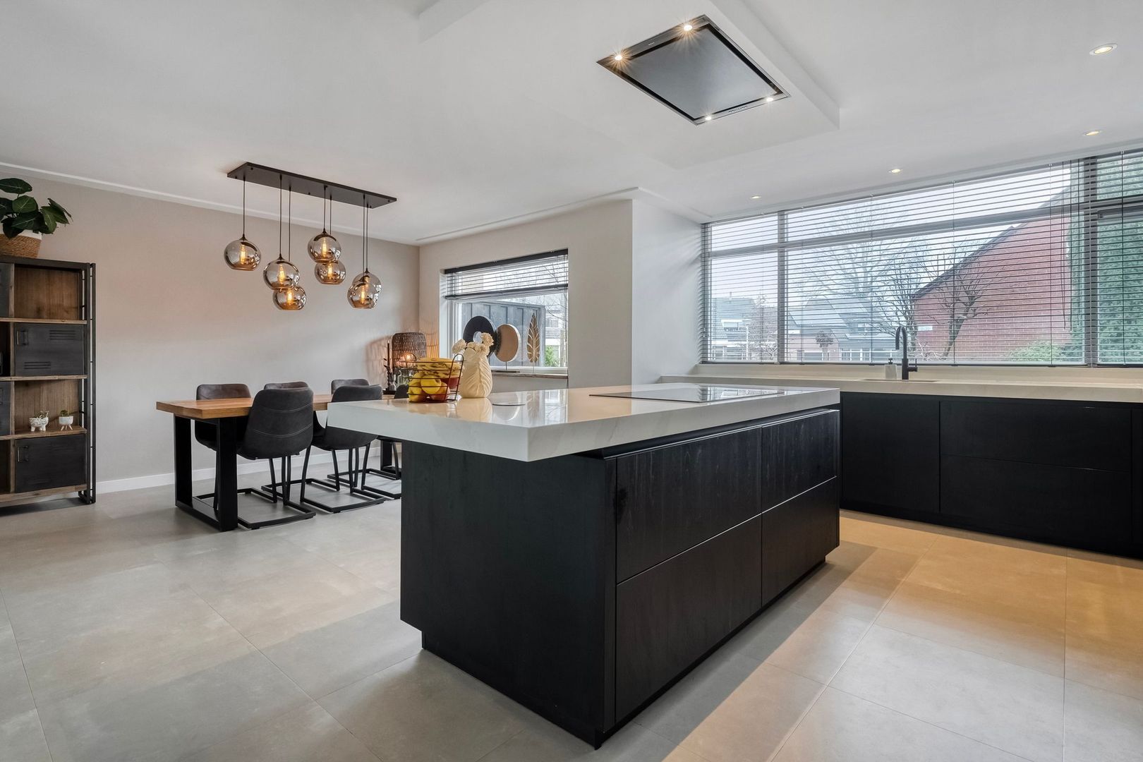 De keuken is voorzien van twee combi-ovens (waarvan één stoomoven) en een Quooker. Het grote raam aan de voorzijde biedt vrij uitzicht over de straat en zorgt voor prettige lichtinval. Aansluitend bevindt zich de ruime eetkamer met toegang tot de hobbykamer.