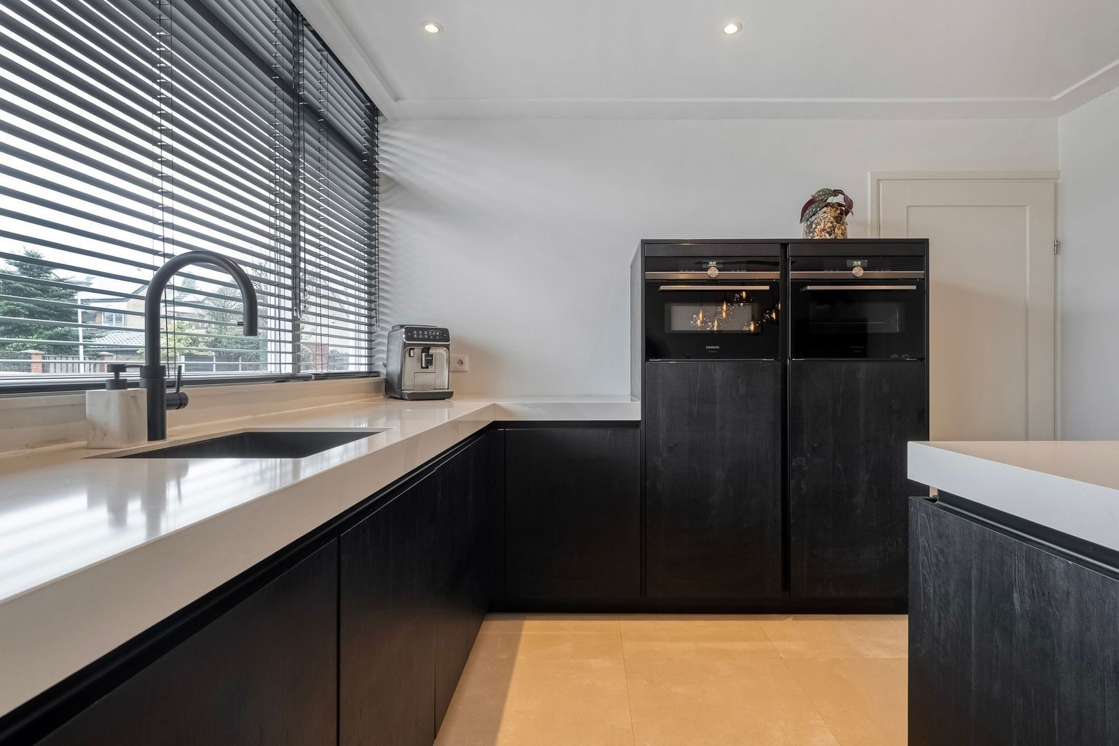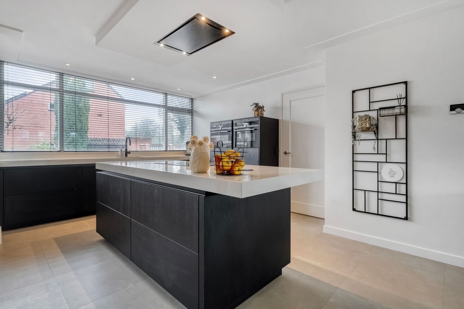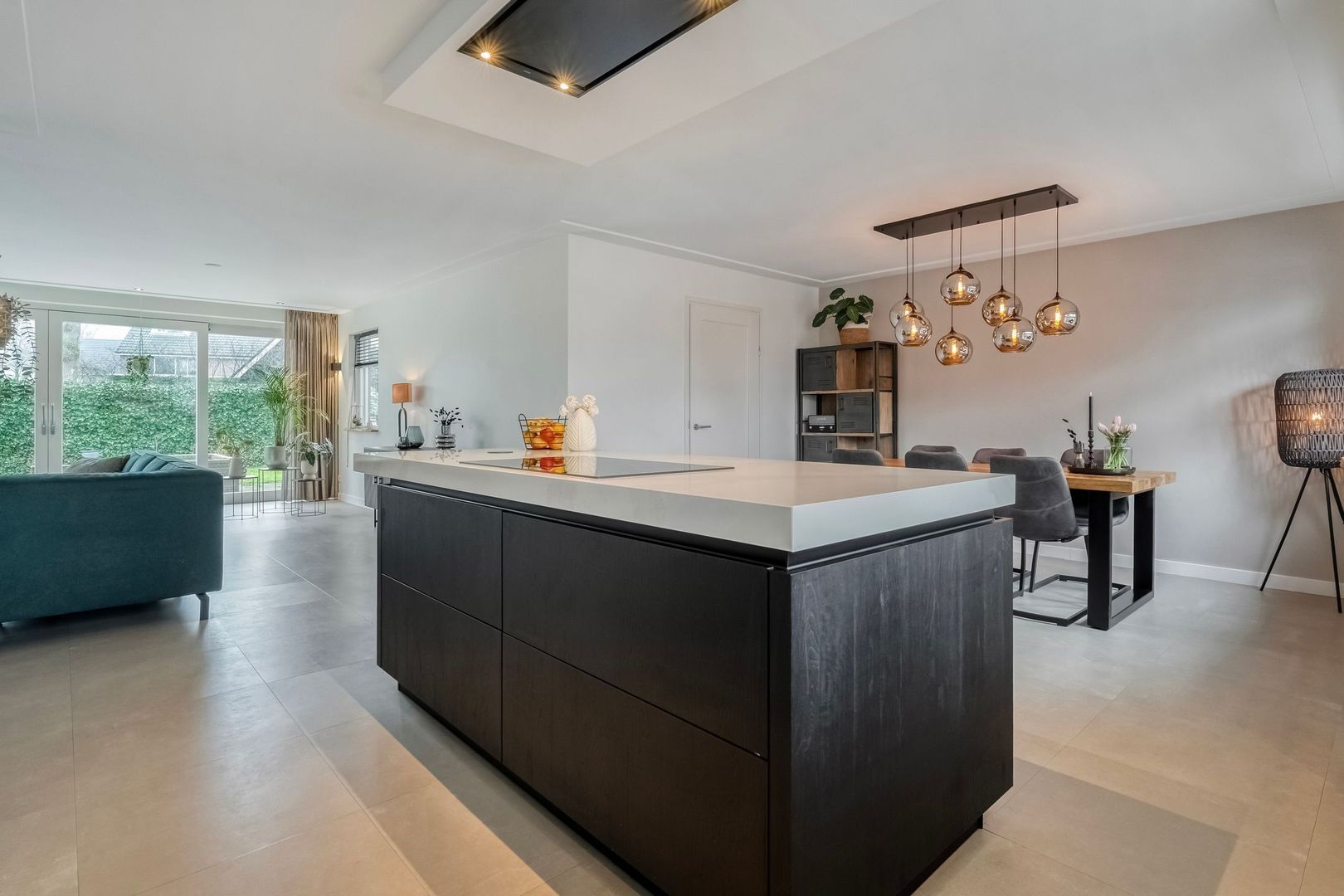 De moderne keuken (2021) is stijlvol en praktisch ingericht. Het ruime kookeiland met inductiekookplaat vormt het centrale punt van de ruimte. Daarnaast is er een hoekopstelling met veel werk- en kastruimte.