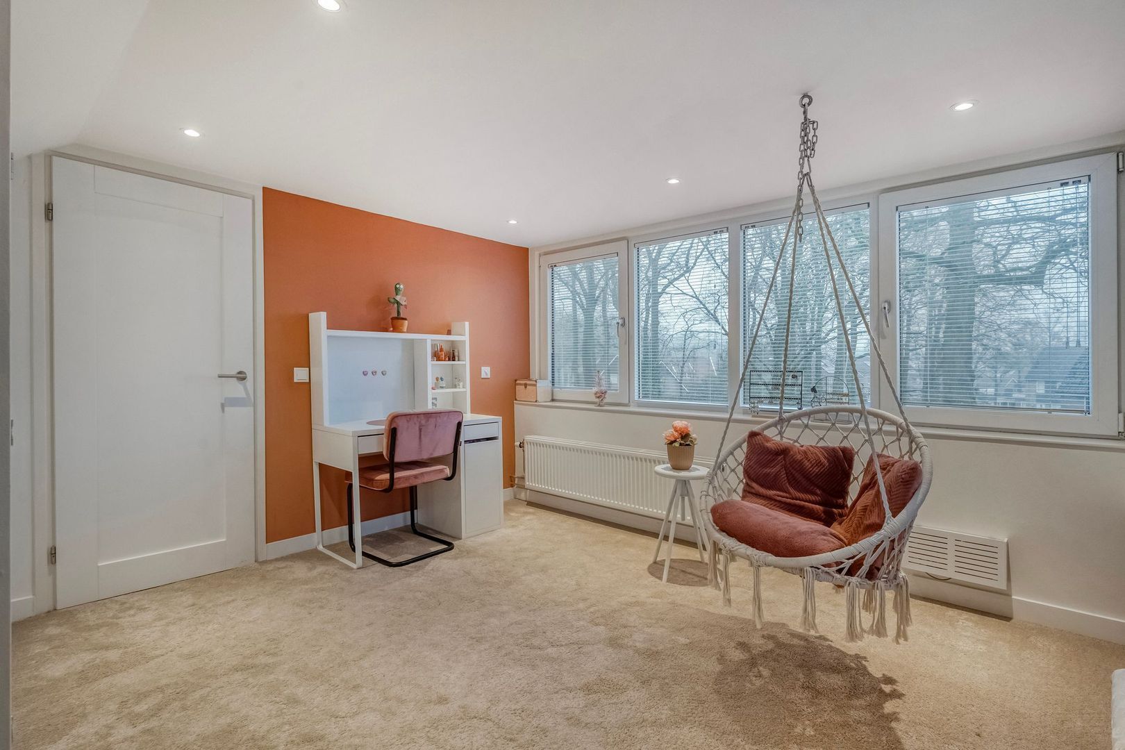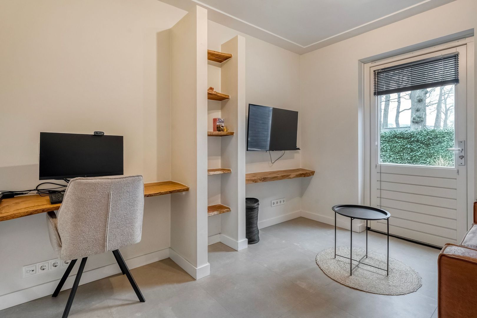 De extra kamer op de begane grond is een veelzijdige ruimte, ideaal als werk-, speel-, slaap of praktijkruimte. Strak afgewerkt en voorzien van tv- en computeraansluiting, met een deur naar de tuin.