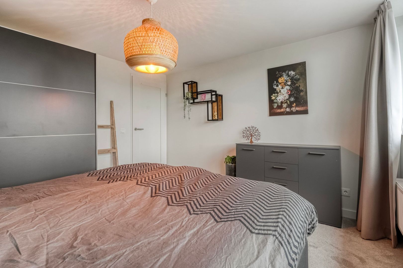 De master bedroom is ruim van opzet en geniet van veel daglicht. Vanuit de kamer is er zicht op het balkon en vrij uitzicht, wat zorgt voor een prettig en open gevoel.