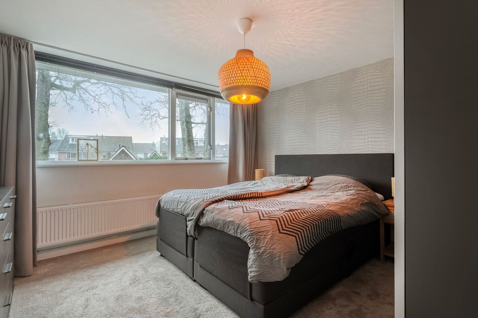 Een opvallend ruime slaapkamer, vergroot door de uitbouw. De kamer beschikt over hoge plafonds, een schuifkastenwand en een radiator. De houten kozijnen met HR++ beglazing zorgen voor veel lichtinval. Vanuit deze kamer is er toegang tot het balkon.