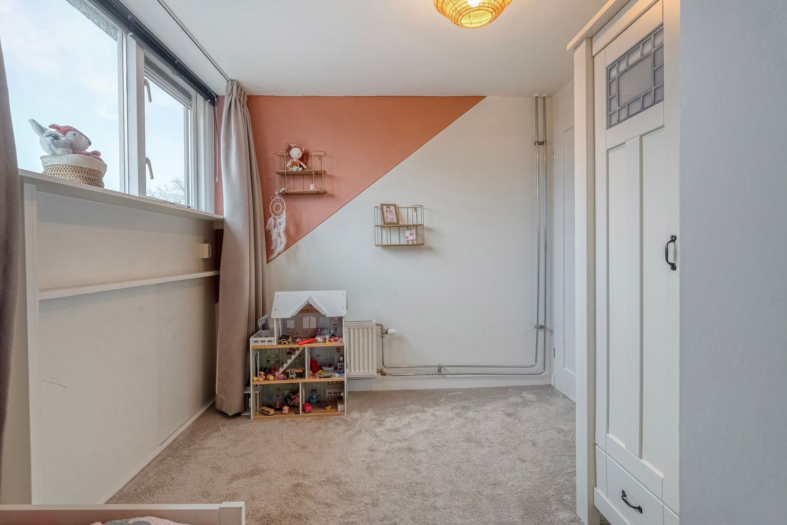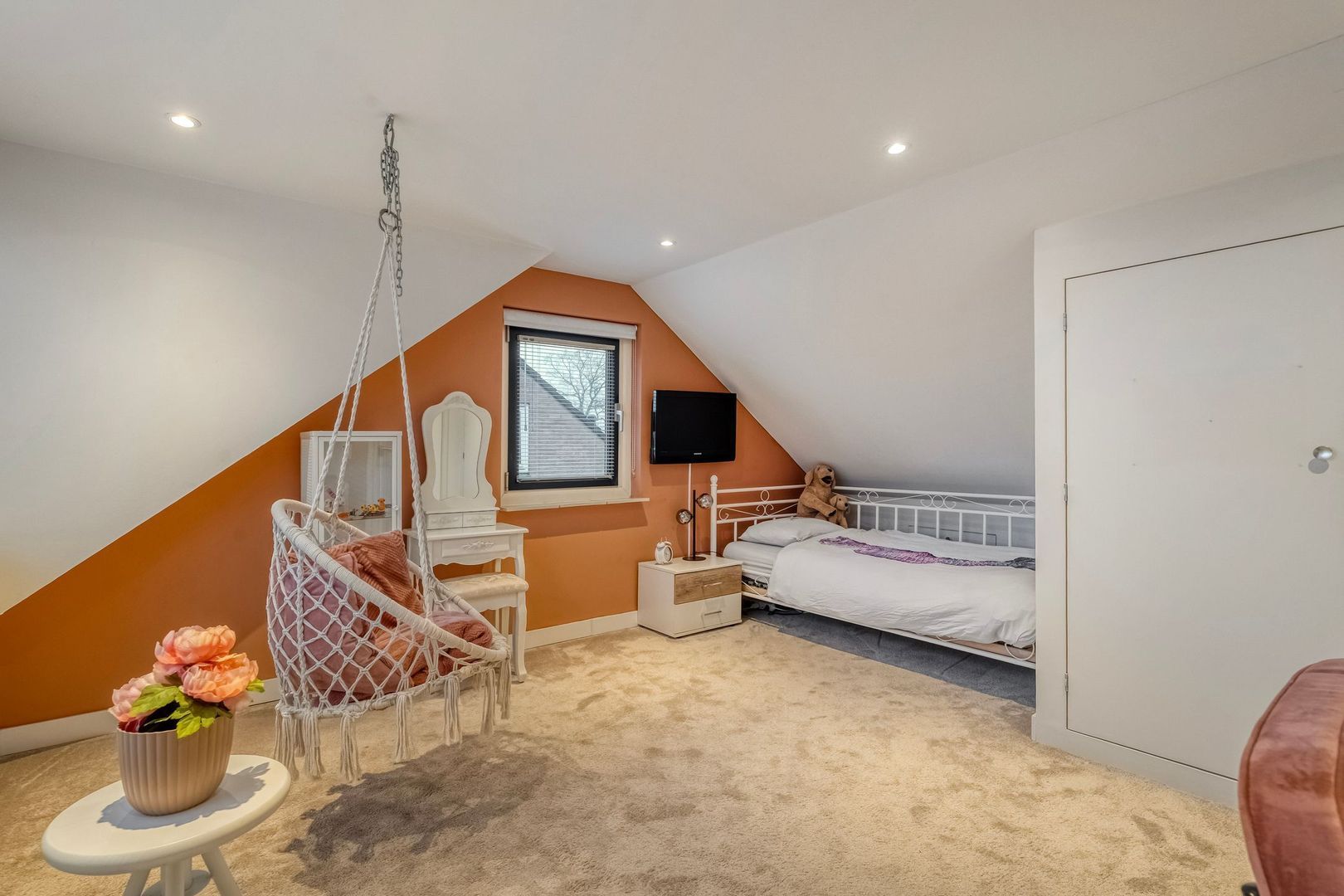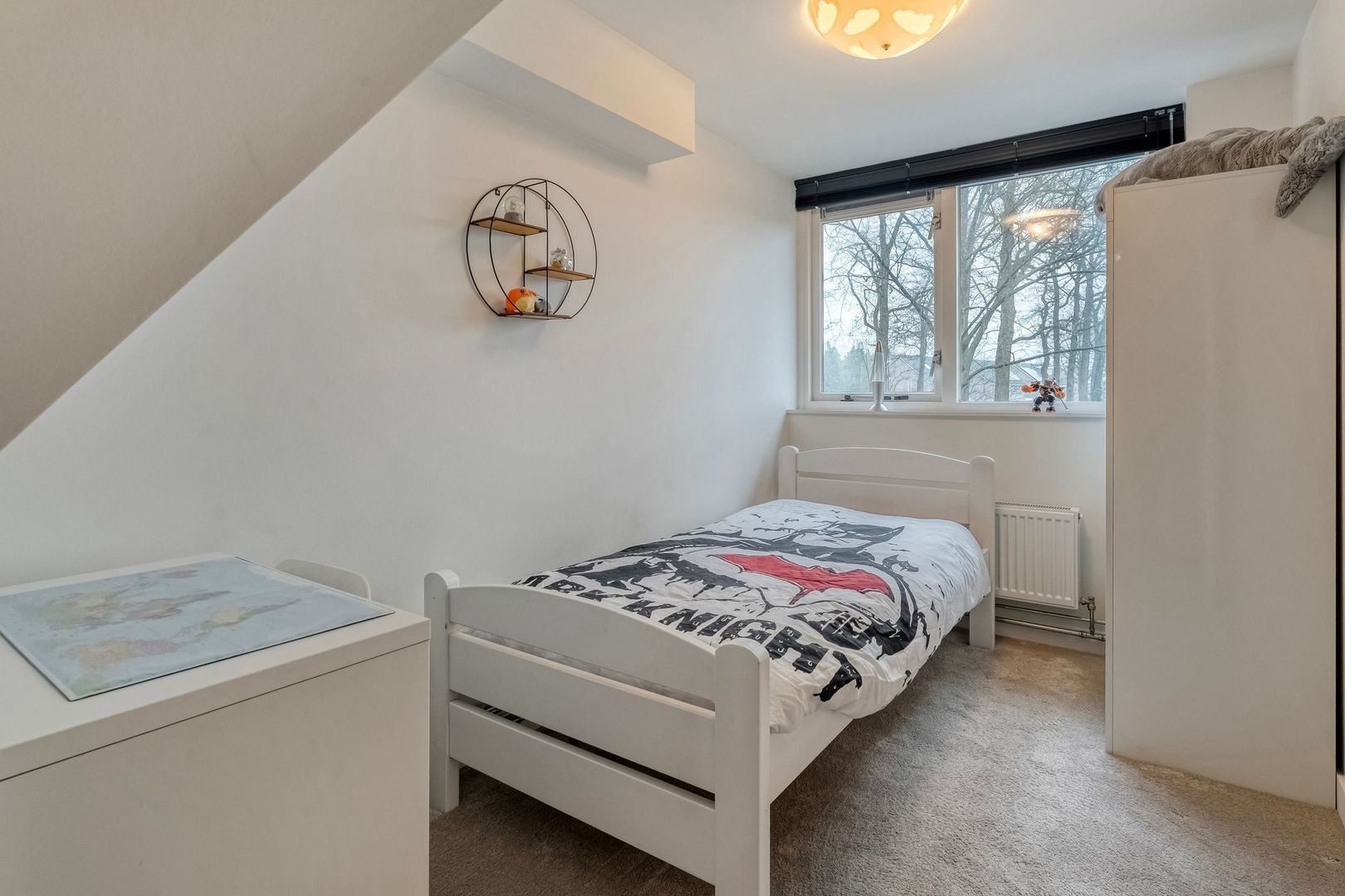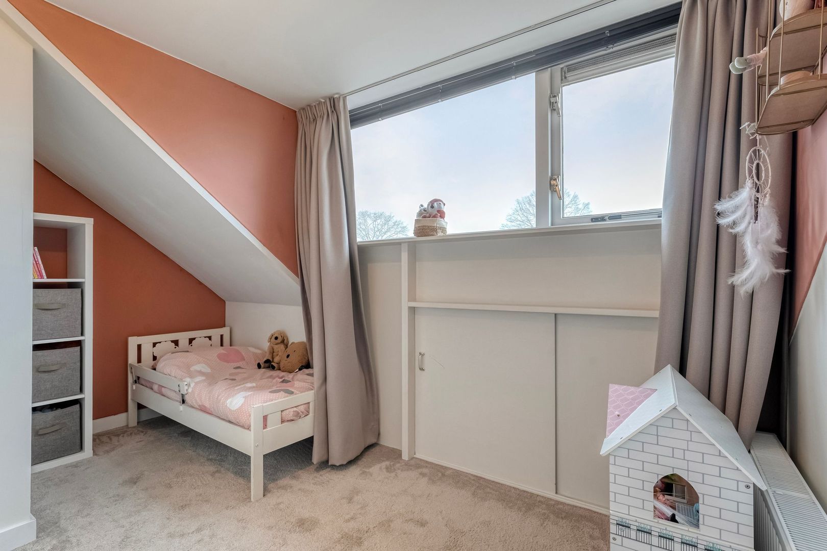 Ook deze kamer beschikt over een groot raam met ventilatierooster en praktische bergruimte onder het knieschot.