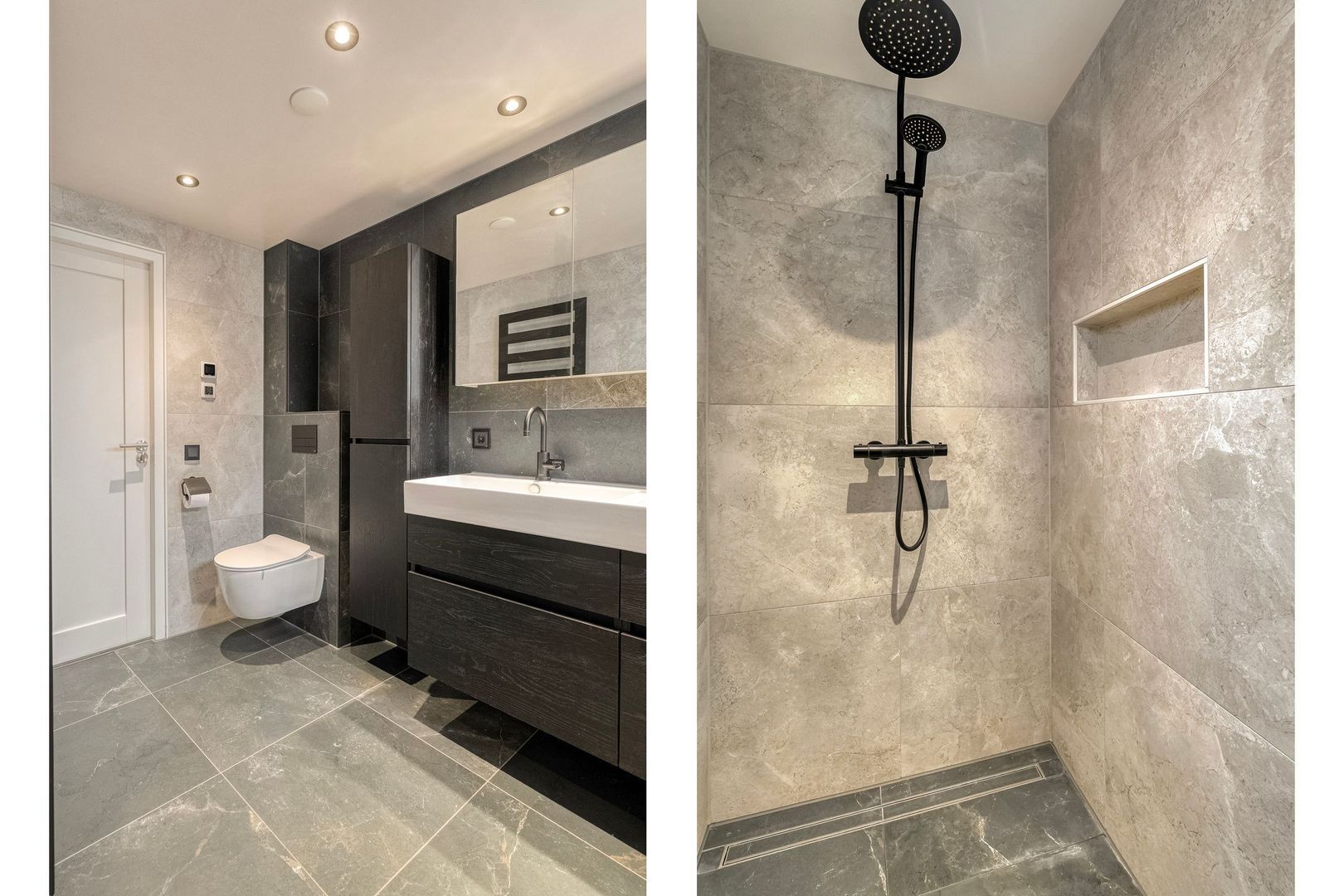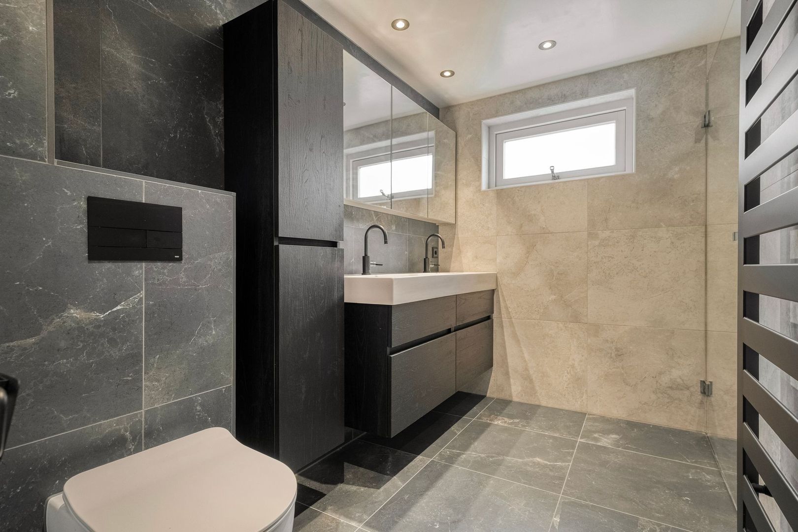De moderne badkamer uit 2021 is uitgevoerd met een inloopdouche met nis en draingoot, een dubbel wastafelmeubel met bijpassende hangkast, een hangtoilet en een designradiator. Daarnaast is de ruimte voorzien van elektrische vloerverwarming, inbouwspots, mechanische ventilatie en een uitvalraam voor natuurlijke ventilatie.