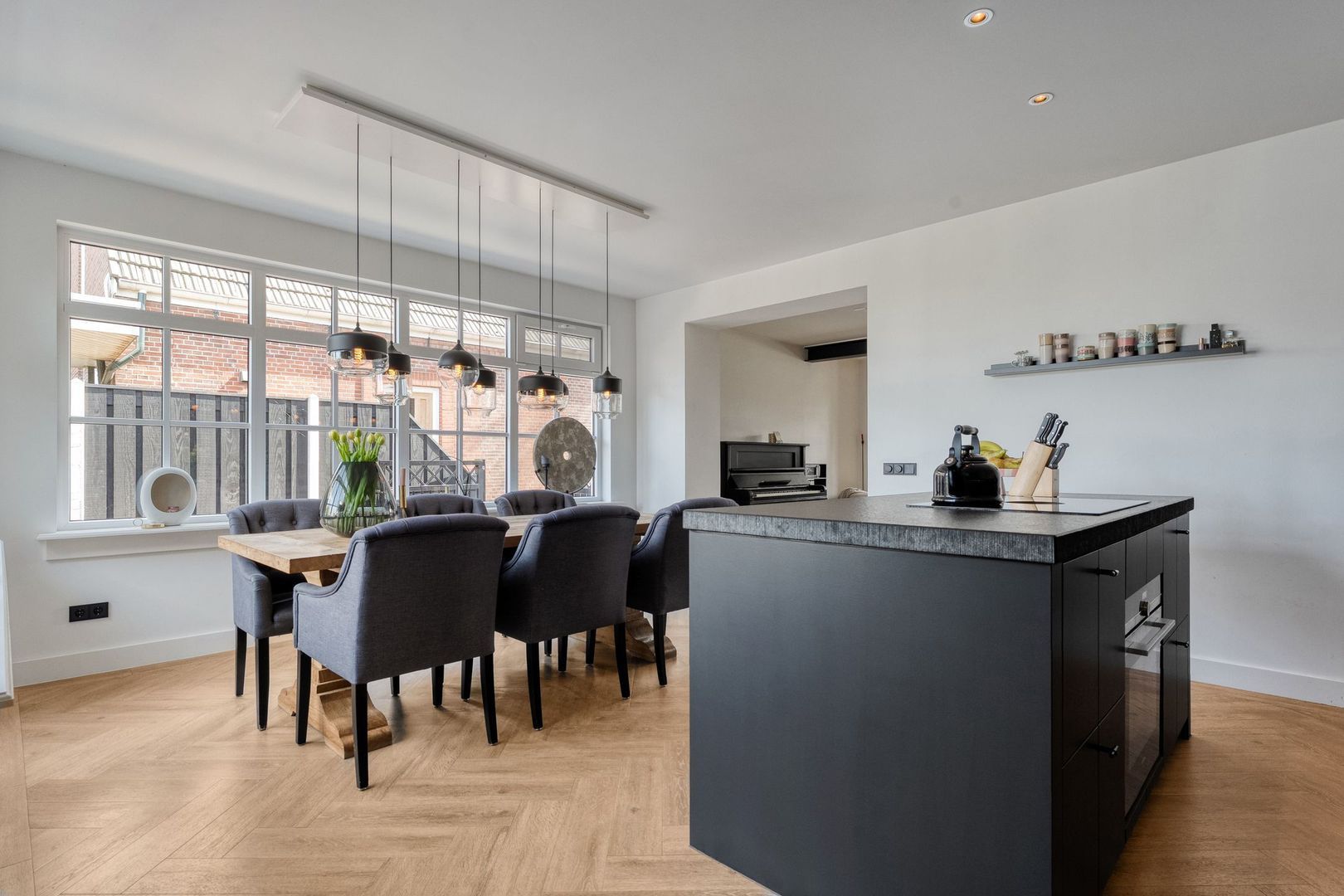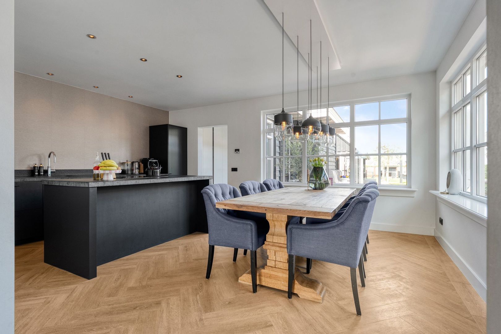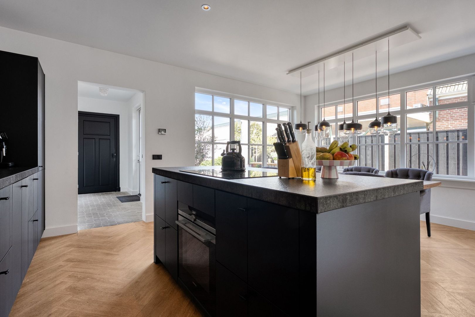 De uitgebouwde keuken vormt een centrale plek in de woning en biedt volop ruimte voor een grote eettafel. Dankzij de grote raampartijen is er veel lichtinval en de aanwezige screens zorgen voor extra comfort. Het kookeiland met inductiekookplaat en het ruime aanrechtblad maken de keuken zowel praktisch als stijlvol. Vanuit de keuken is er een open verbinding naar de achtergelegen hal, die toegang biedt tot de badkamer en de tuin.