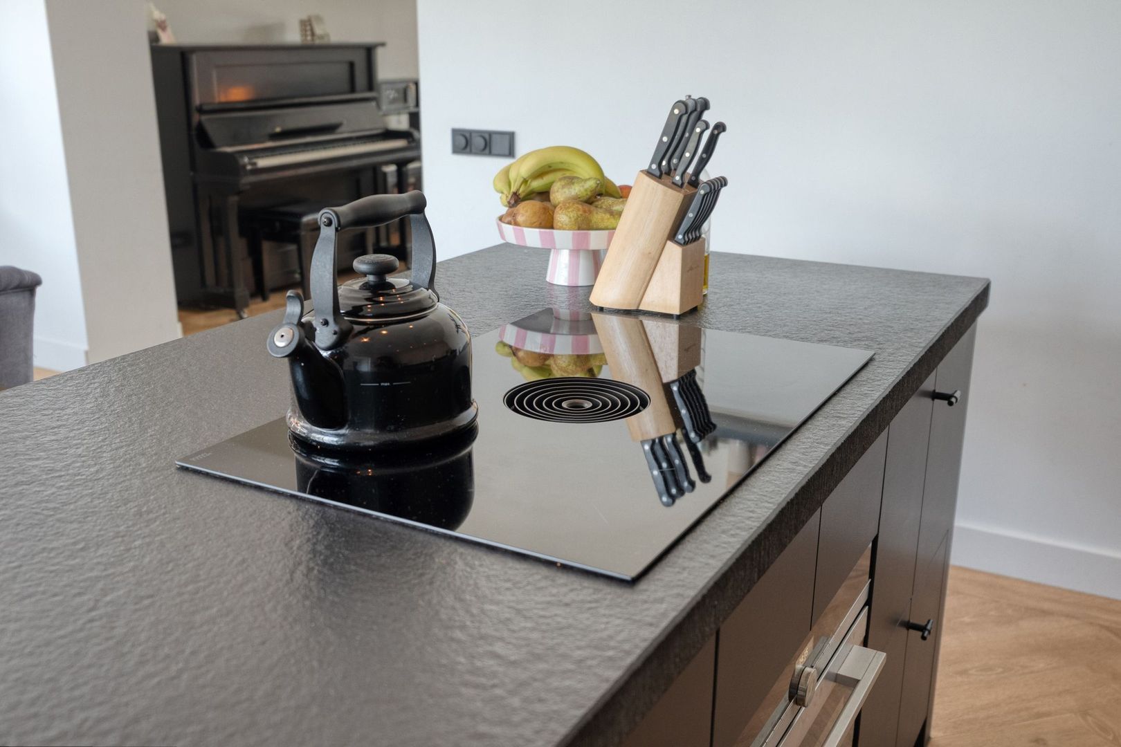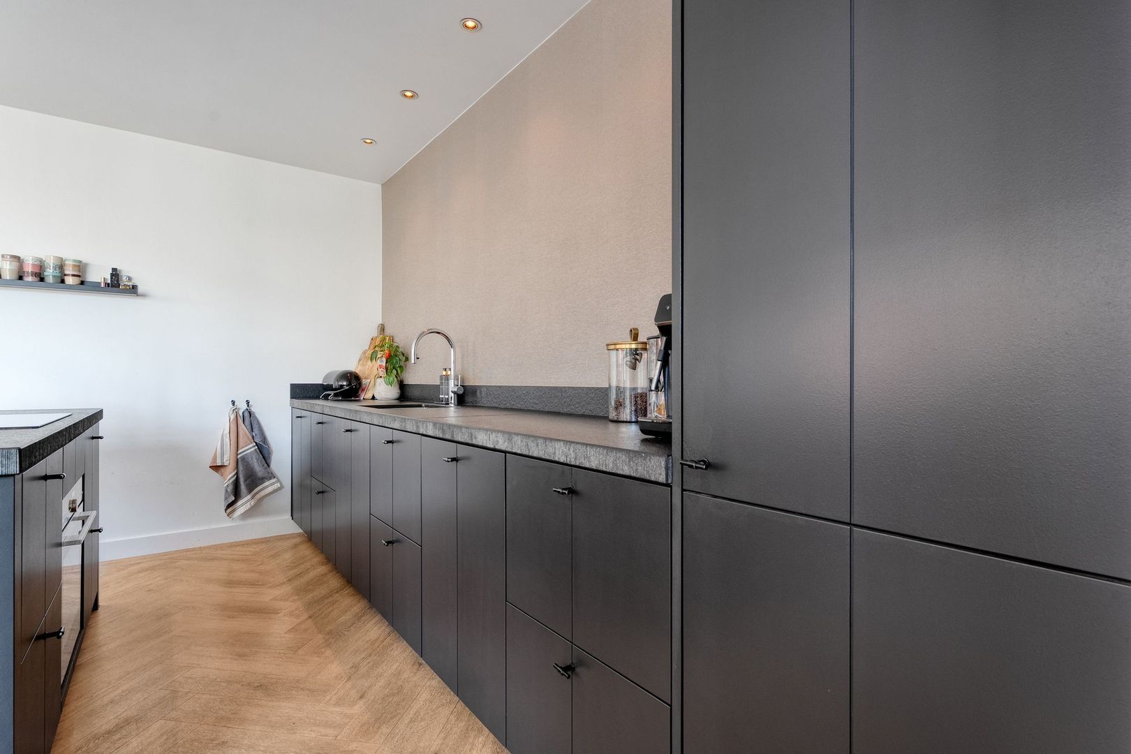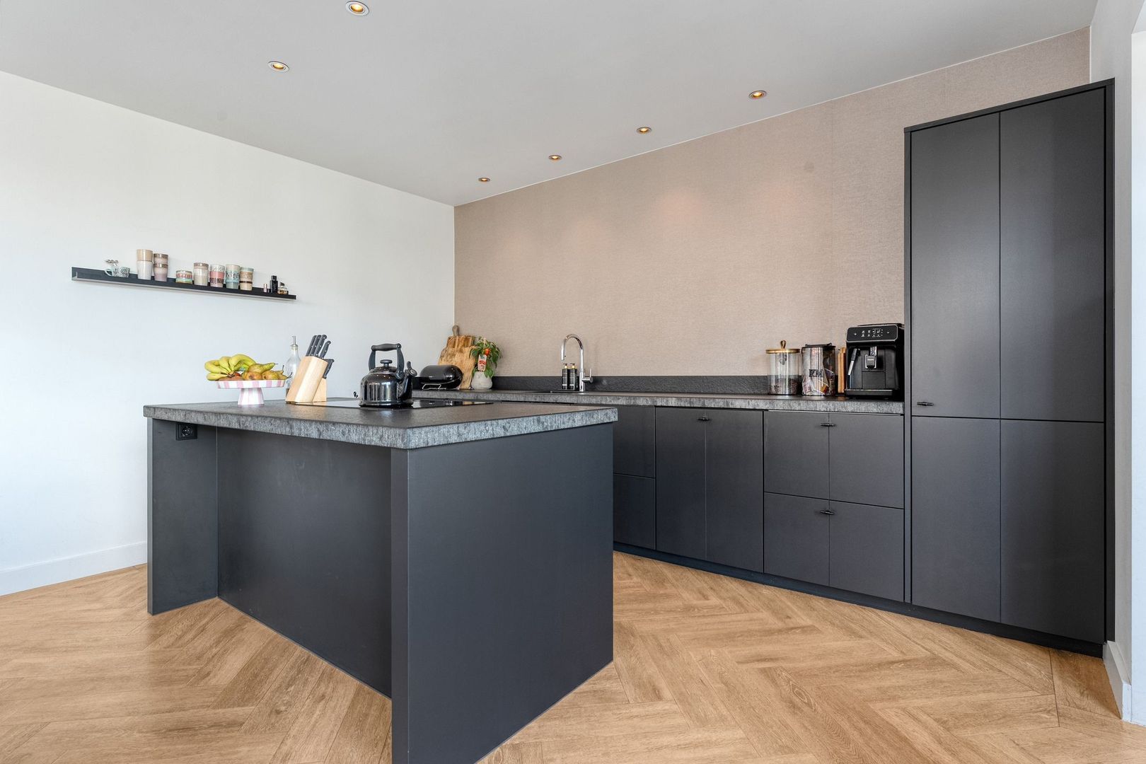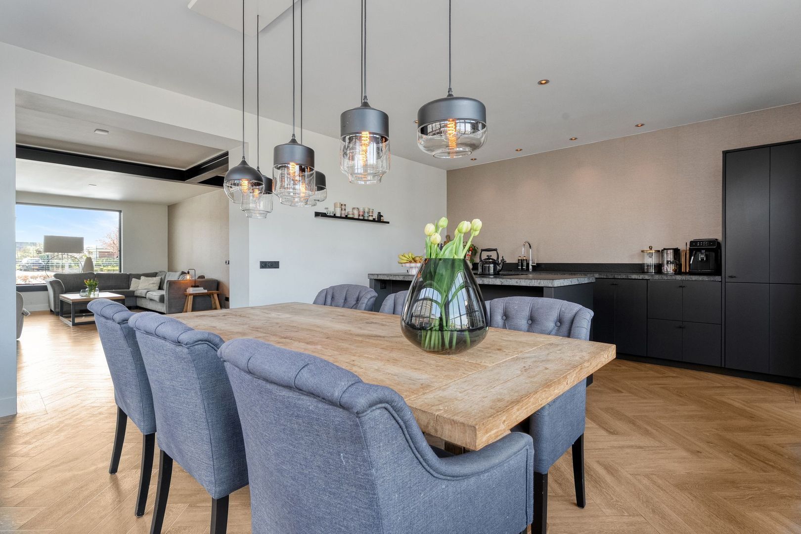 De uitgebouwde keuken vormt een centrale plek in de woning en biedt volop ruimte voor een grote eettafel. Dankzij de grote raampartijen is er veel lichtinval en de aanwezige screens zorgen voor extra comfort. Het kookeiland met inductiekookplaat en het ruime aanrechtblad maken de keuken zowel praktisch als stijlvol. Vanuit de keuken is er een open verbinding naar de achtergelegen hal, die toegang biedt tot de badkamer en de tuin.