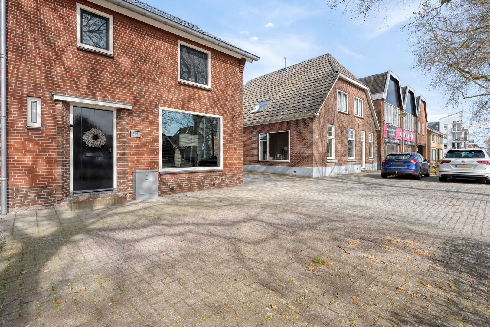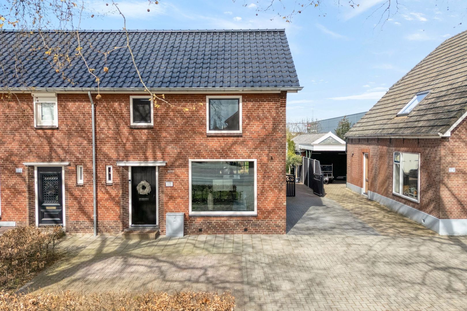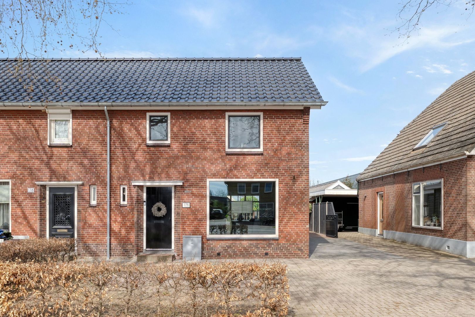 De ruime oprit aan de zijkant biedt voldoende parkeergelegenheid op eigen terrein.