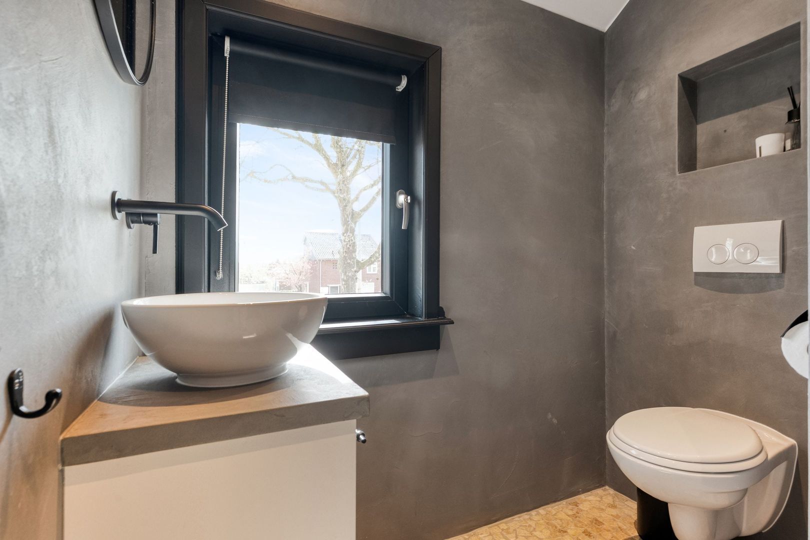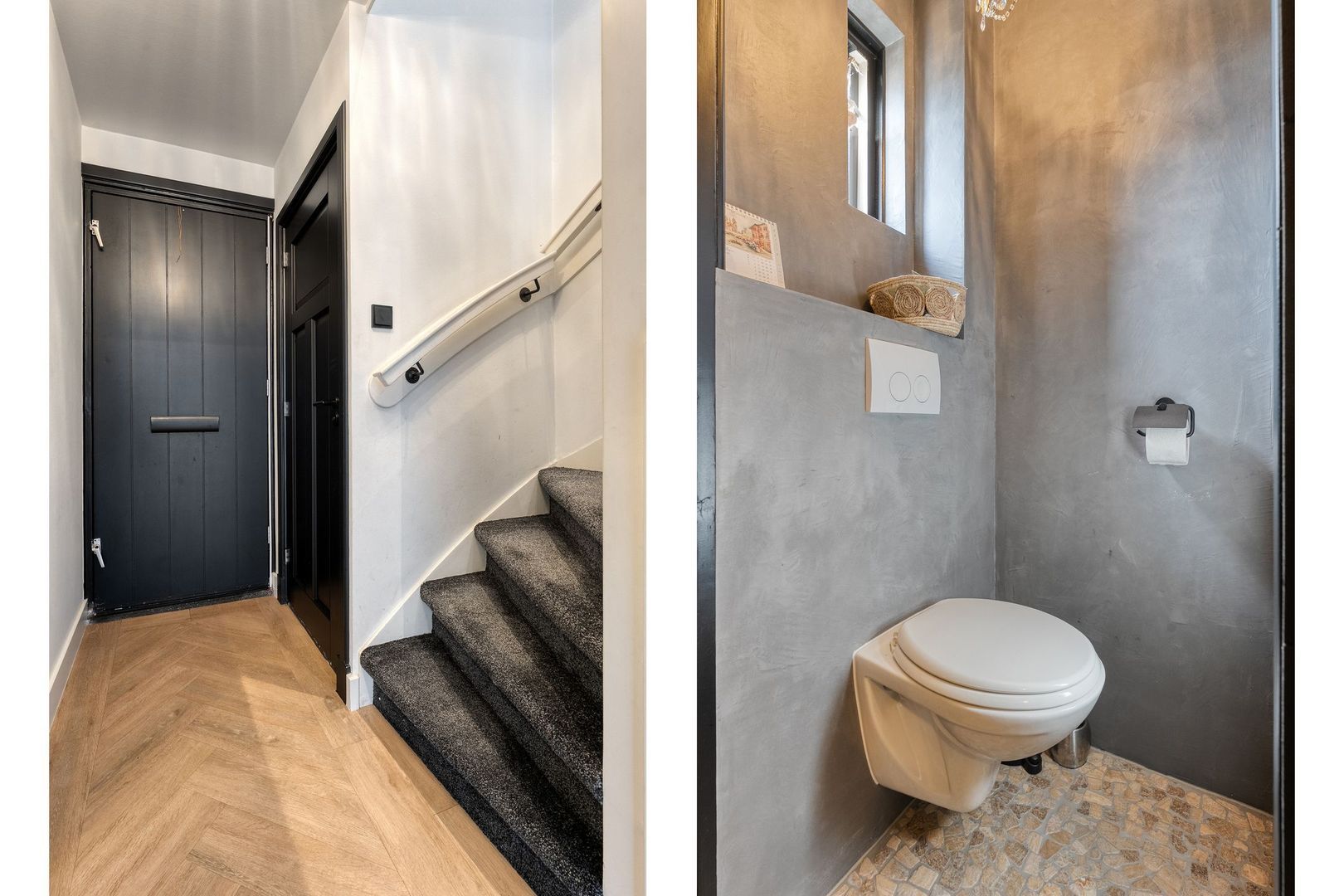 In de hal bevindt zich de vernieuwde meterkast en een toiletruimte met nis, uitgevoerd in een moderne stijl.
