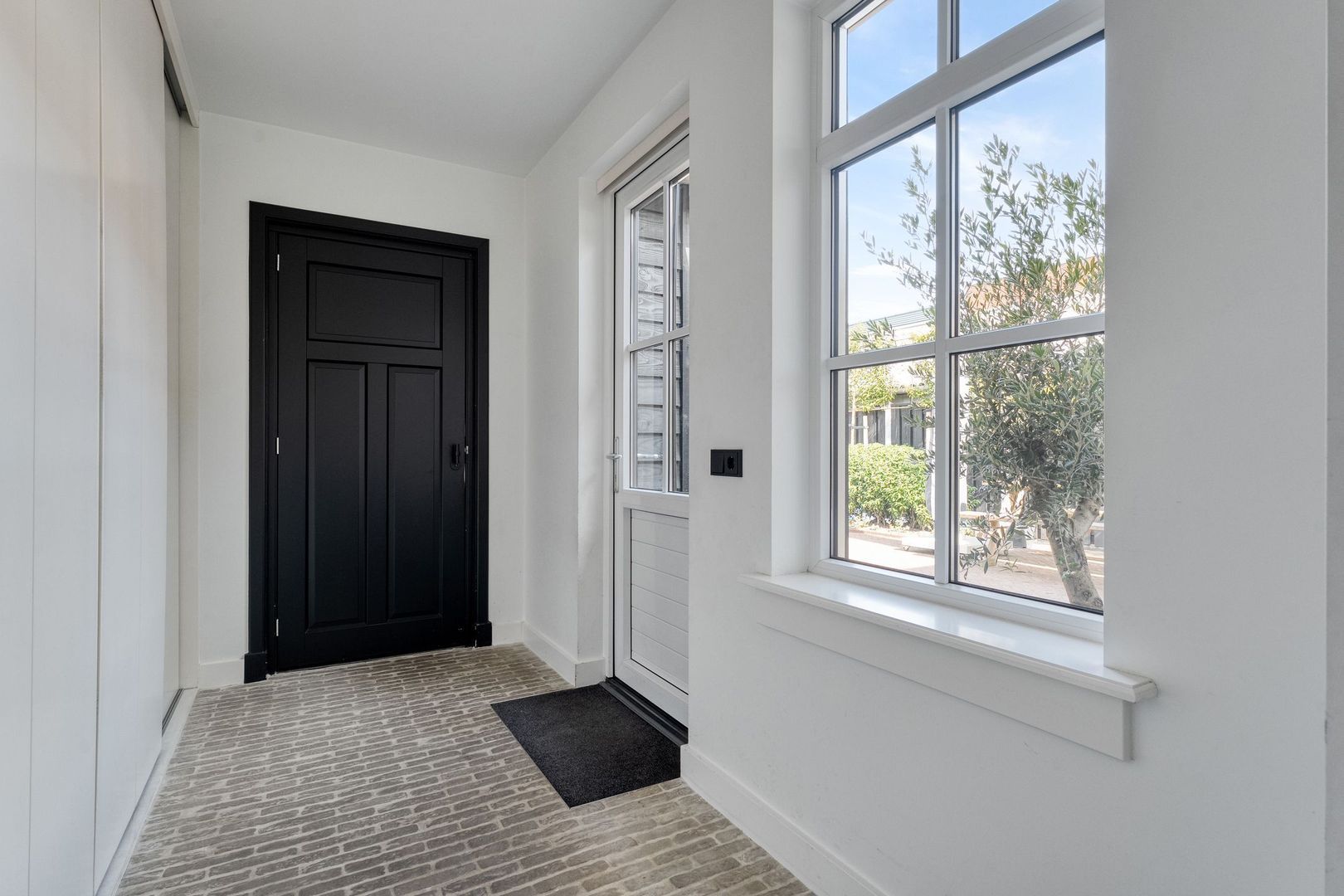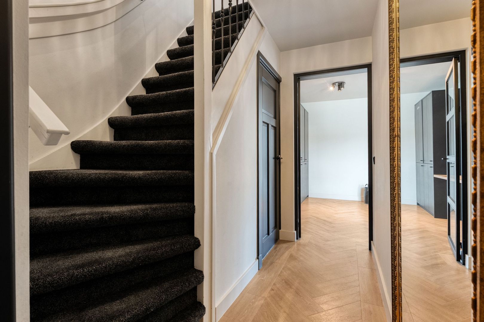 De achterhal is praktisch ingericht en voorzien van een grote schuifkastenwand met opstelling voor wasmachine en droger. Deze ruimte vormt een functionele schakel tussen de keuken, badkamer en tuin.