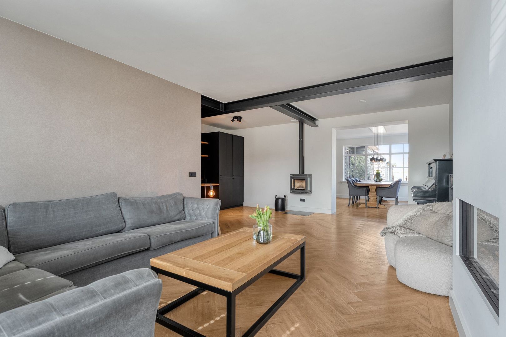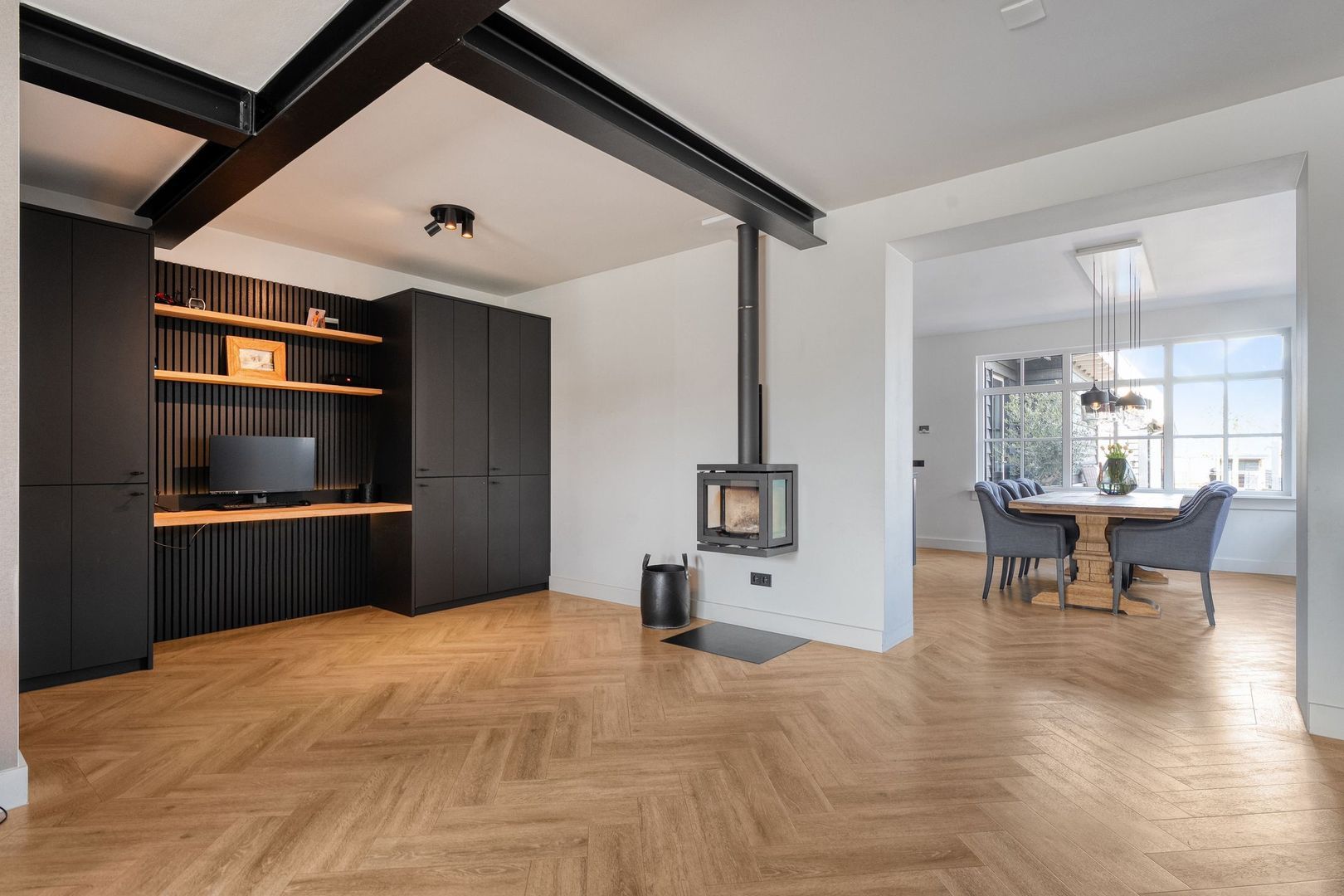 De woonkamer is aan de voorzijde van de woning gesitueerd en biedt vrij uitzicht over de straat. De ruimte is royaal van opzet en beschikt over zowel een gaskachel als een houtkachel, wat zorgt voor extra sfeer en warmte. Aansluitend bevindt zich een praktische werkruimte met een grote kastenwand. De open doorgang naar de keuken zorgt voor een prettige verbinding tussen de verschillende leefruimtes.