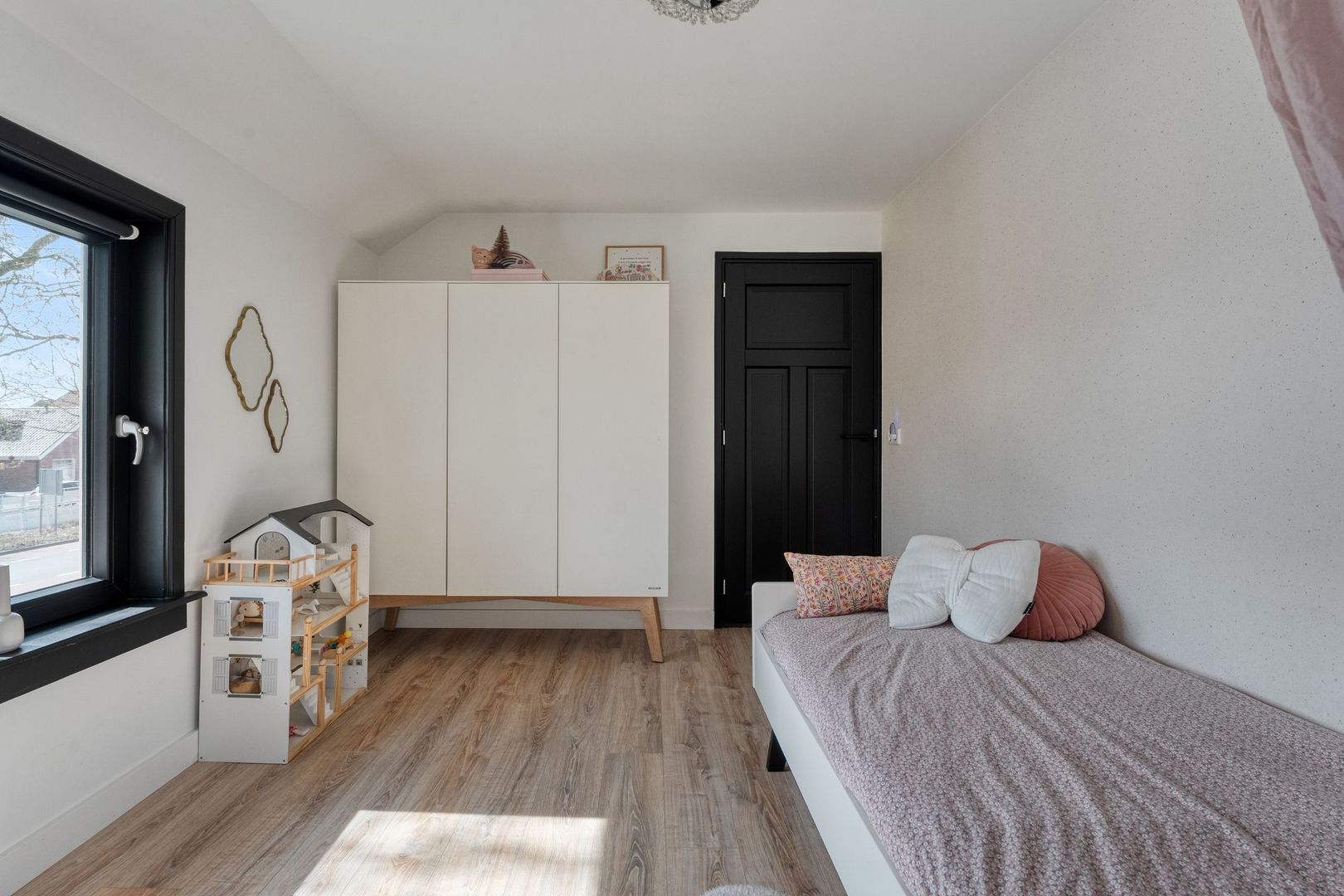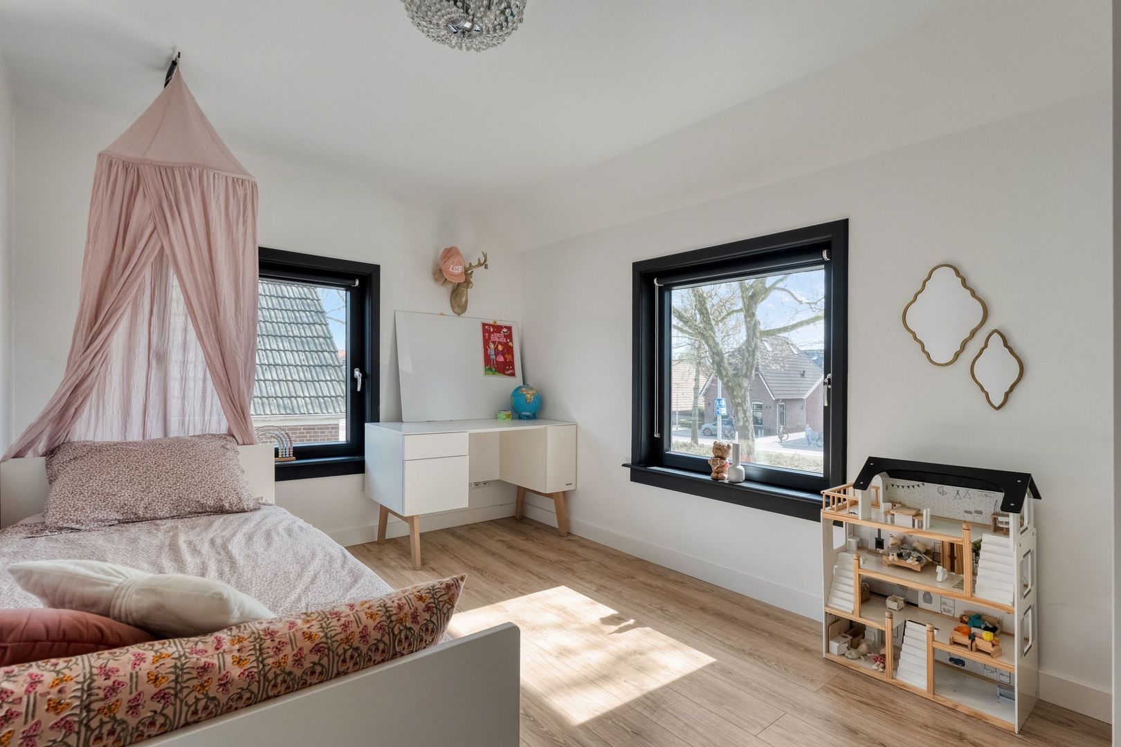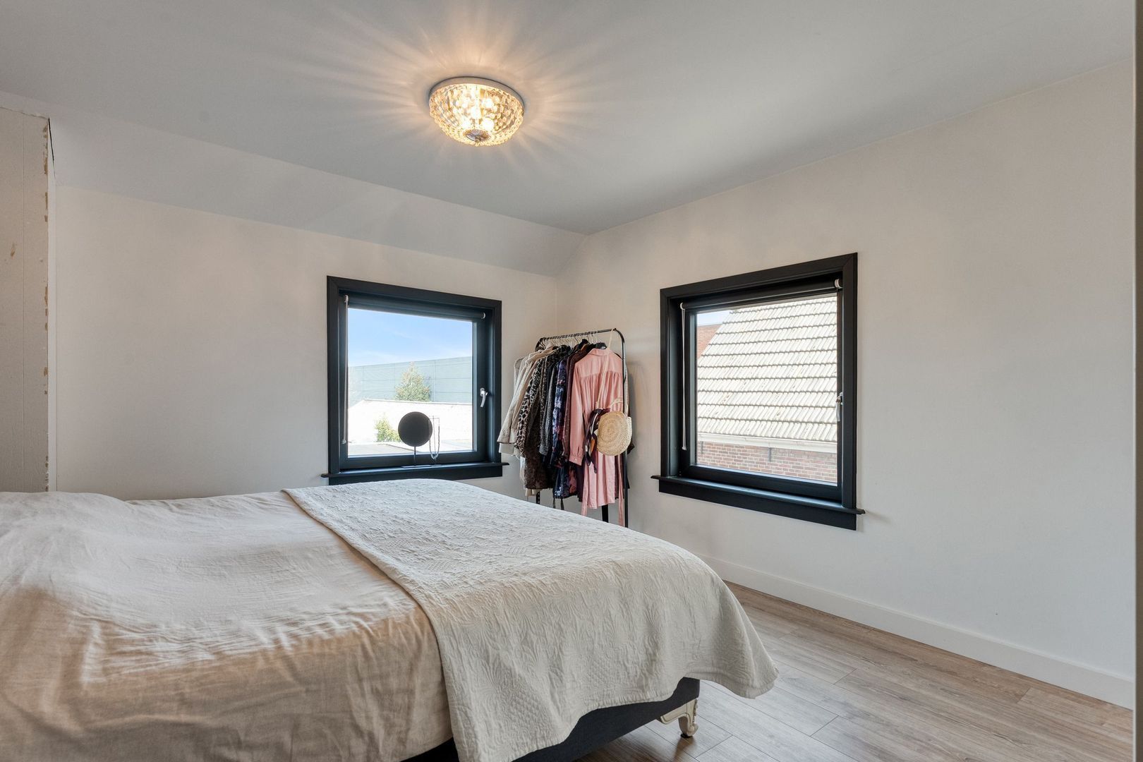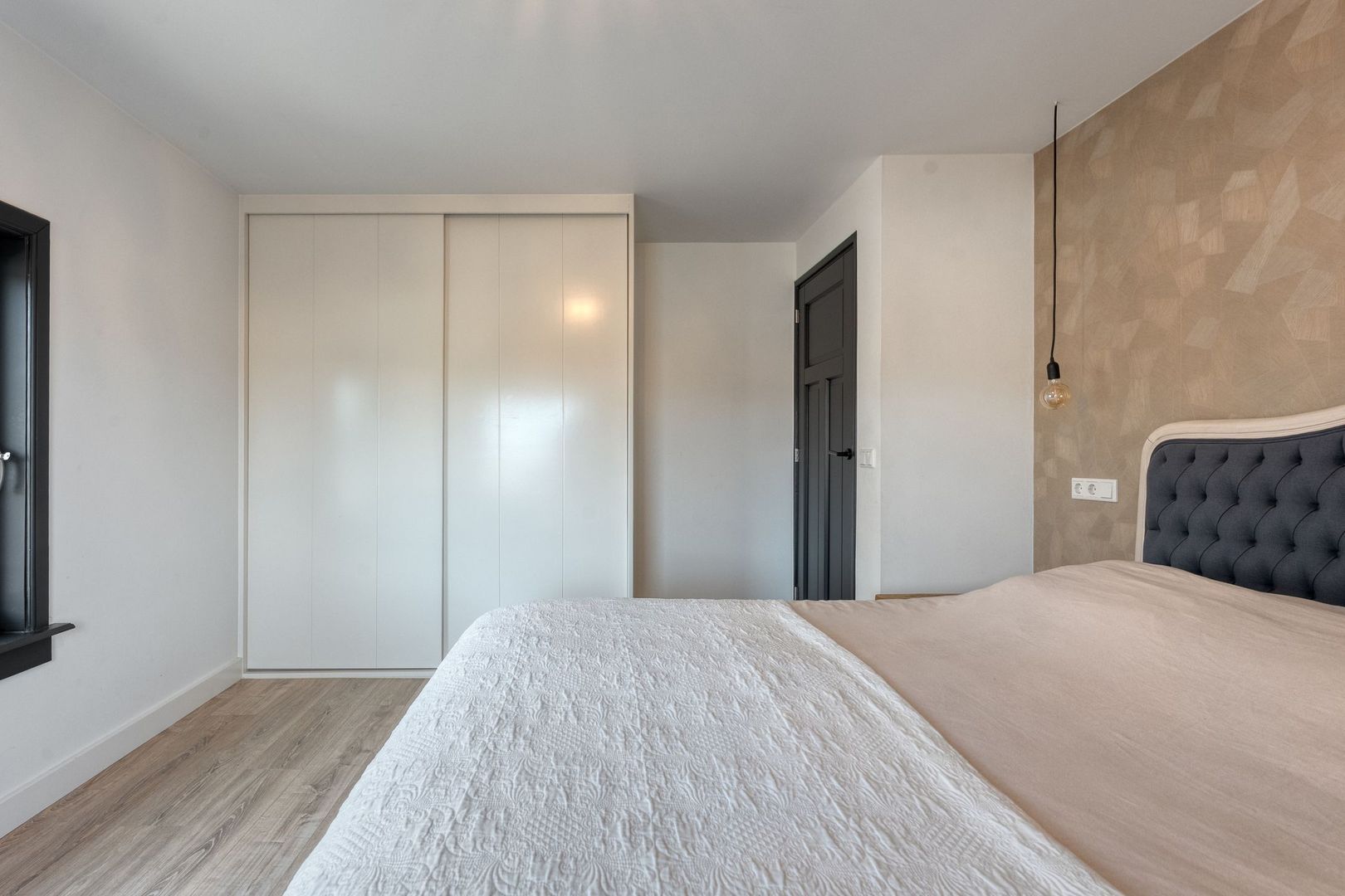De master bedroom is ruim van opzet en beschikt over twee grote kunststof draaikiepramen, wat zorgt voor veel lichtinval. Daarnaast is de kamer voorzien van een grote schuifkastenwand en een strakke afwerking met hoge plinten.