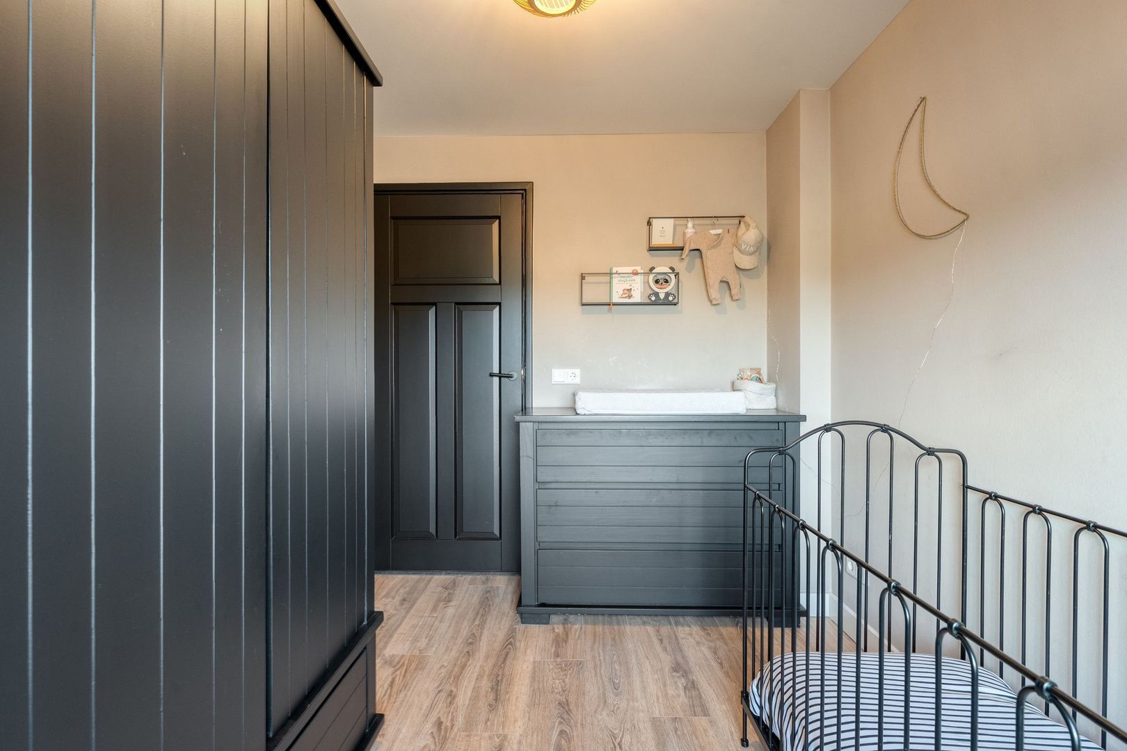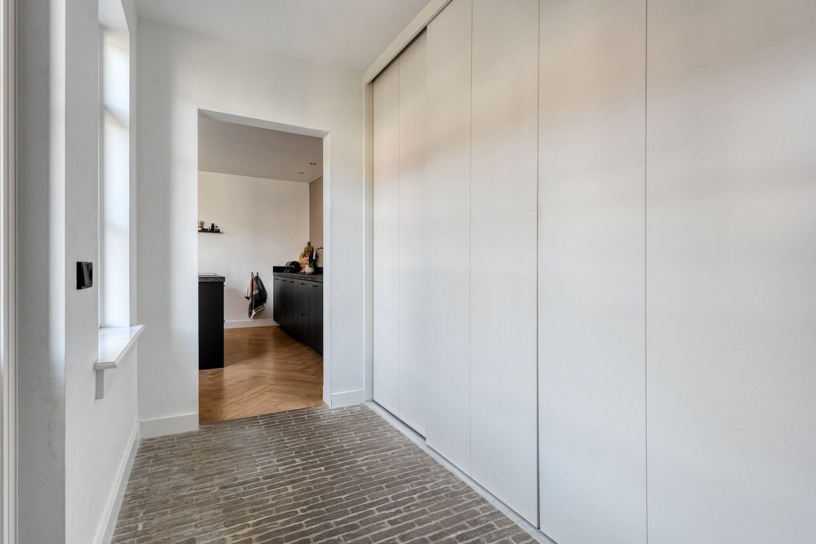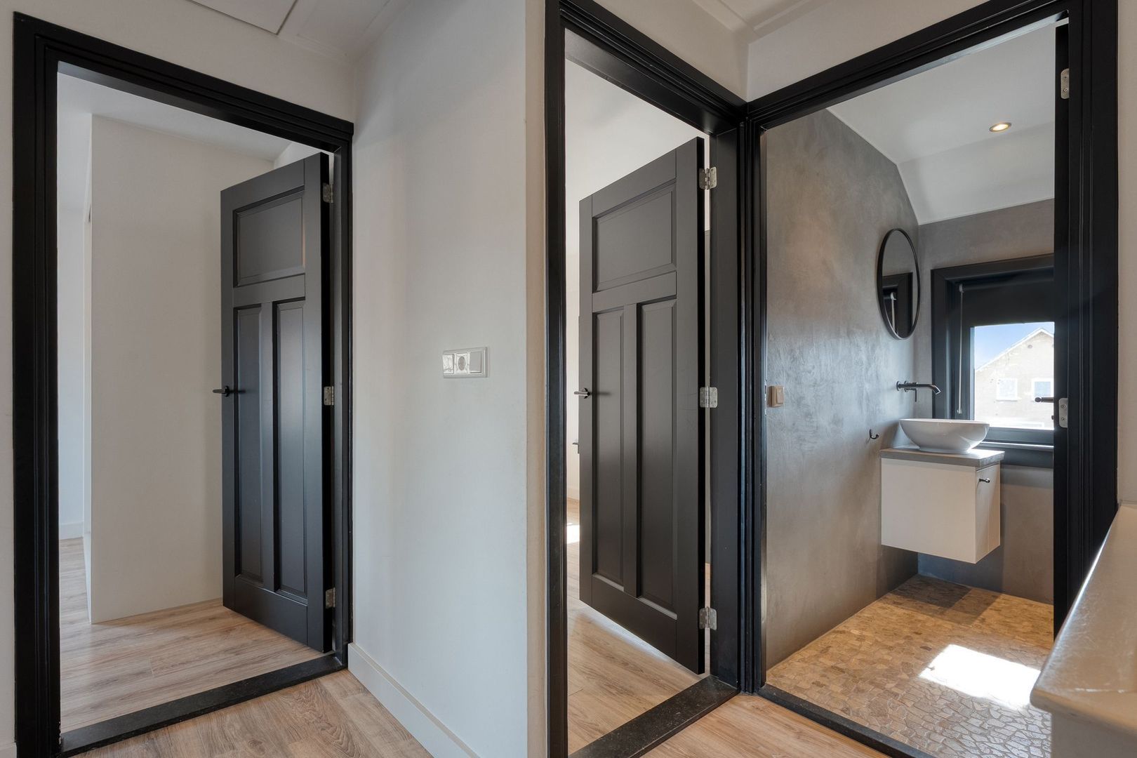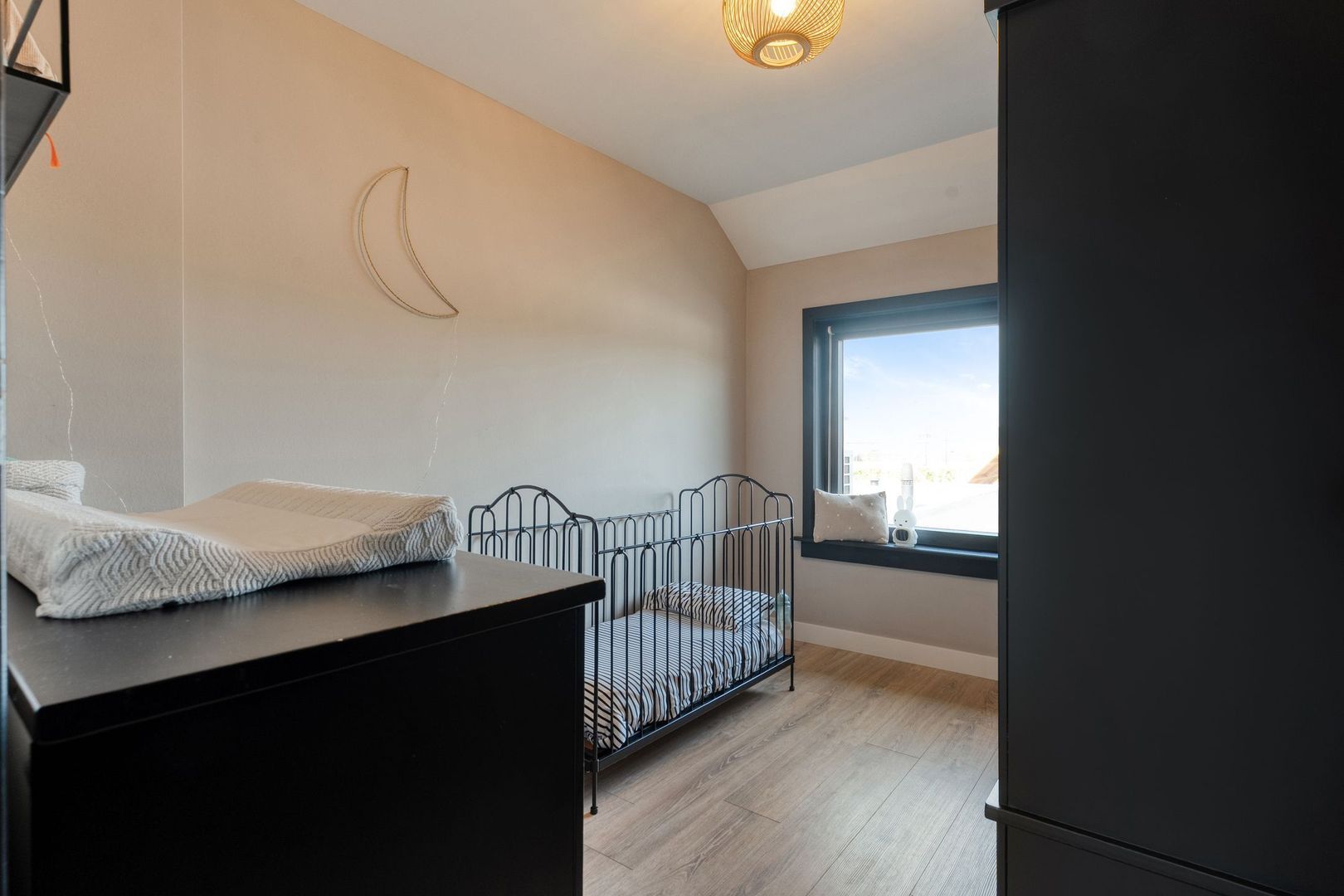 De master bedroom is ruim van opzet en beschikt over twee grote kunststof draaikiepramen, wat zorgt voor veel lichtinval. Daarnaast is de kamer voorzien van een grote schuifkastenwand en een strakke afwerking met hoge plinten.