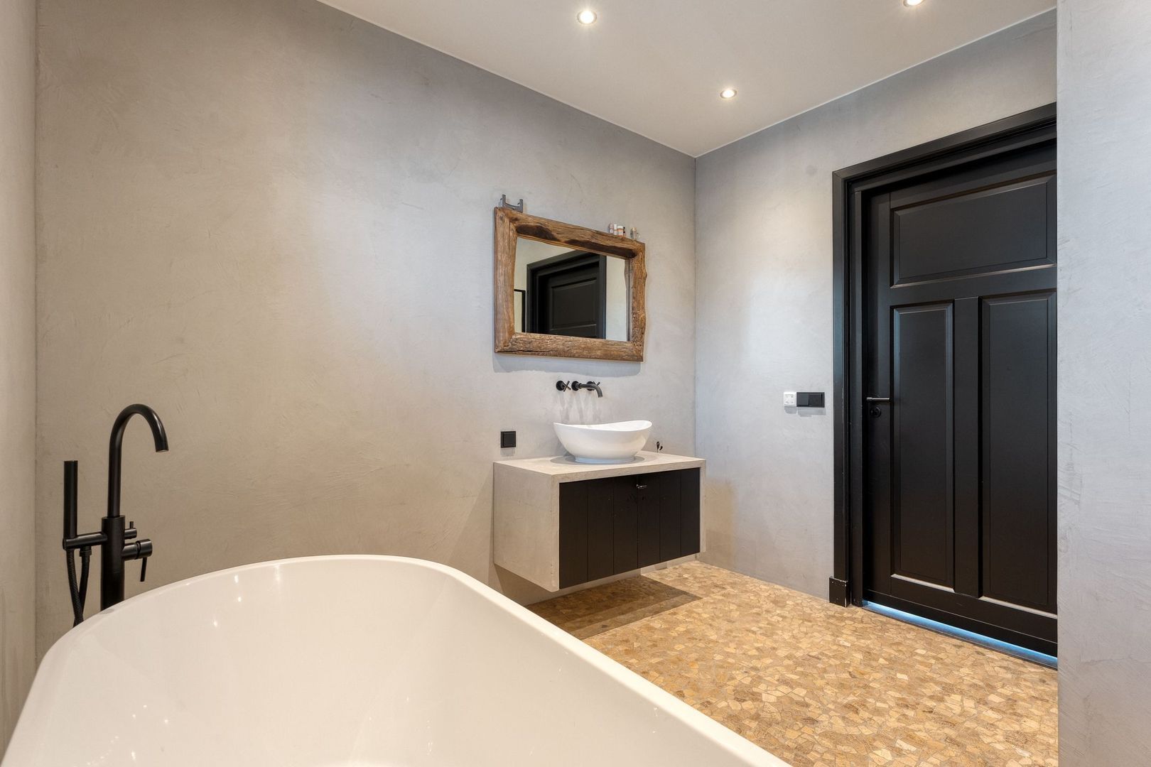 De badkamer op de begane grond is modern uitgevoerd en compleet ingericht met een ligbad, inloopdouche, hangtoilet en een wastafelmeubel. Inbouwspots en mechanische ventilatie zorgen voor extra comfort en een nette afwerking.