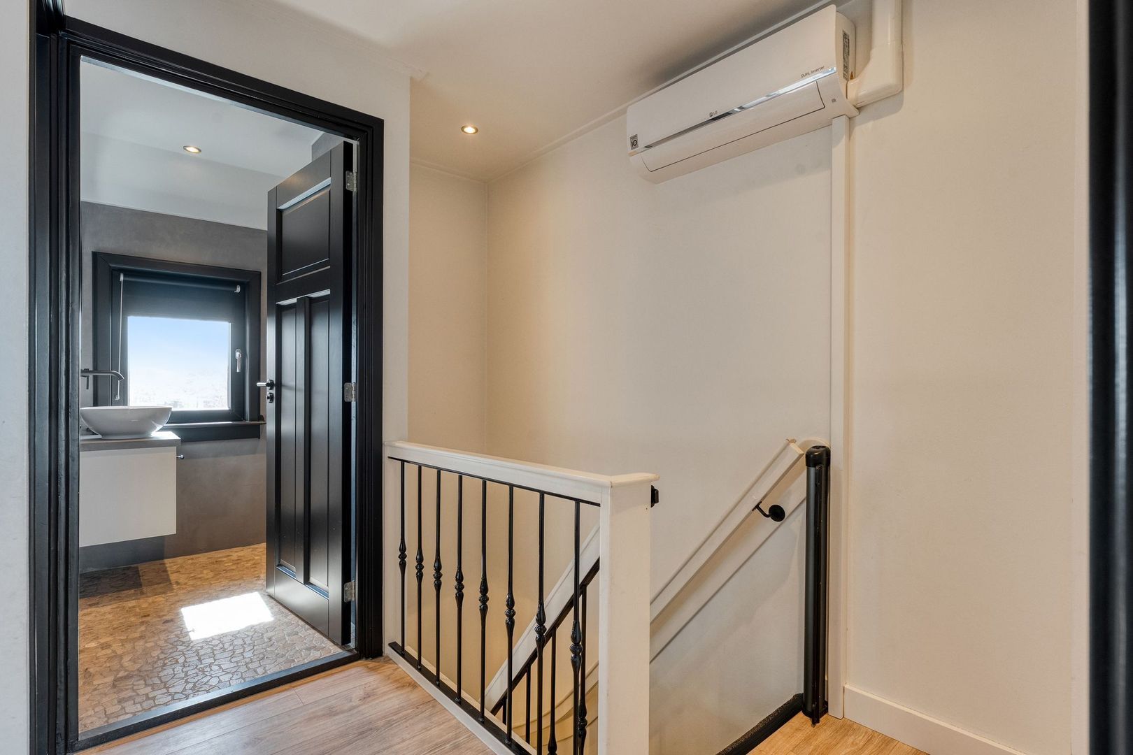 De eerste verdieping is verzorgd afgewerkt en beschikt over drie slaapkamers en een separate toiletruimte. De overloop is voorzien van airconditioning en inbouwspots, wat zorgt voor extra comfort.