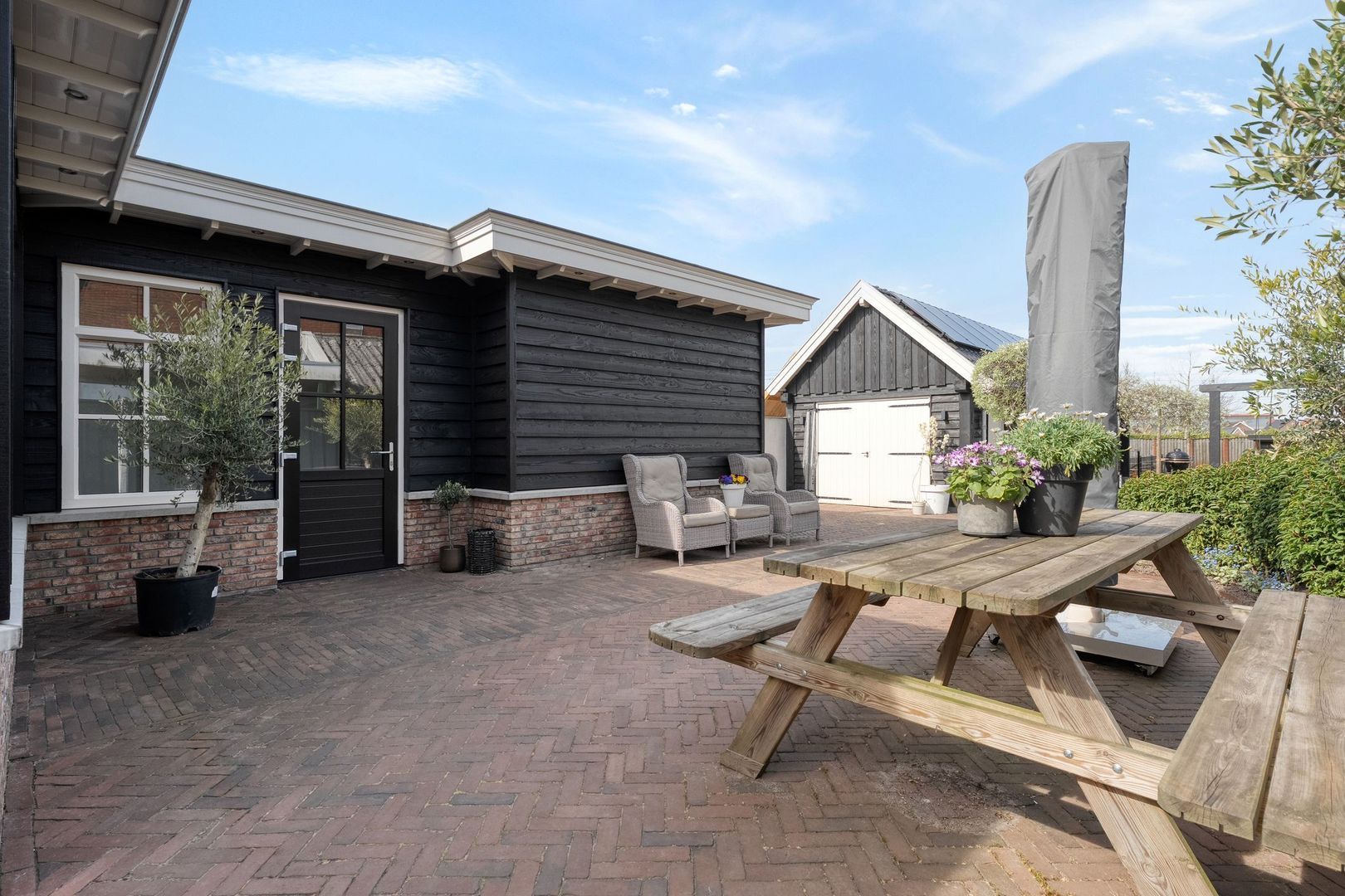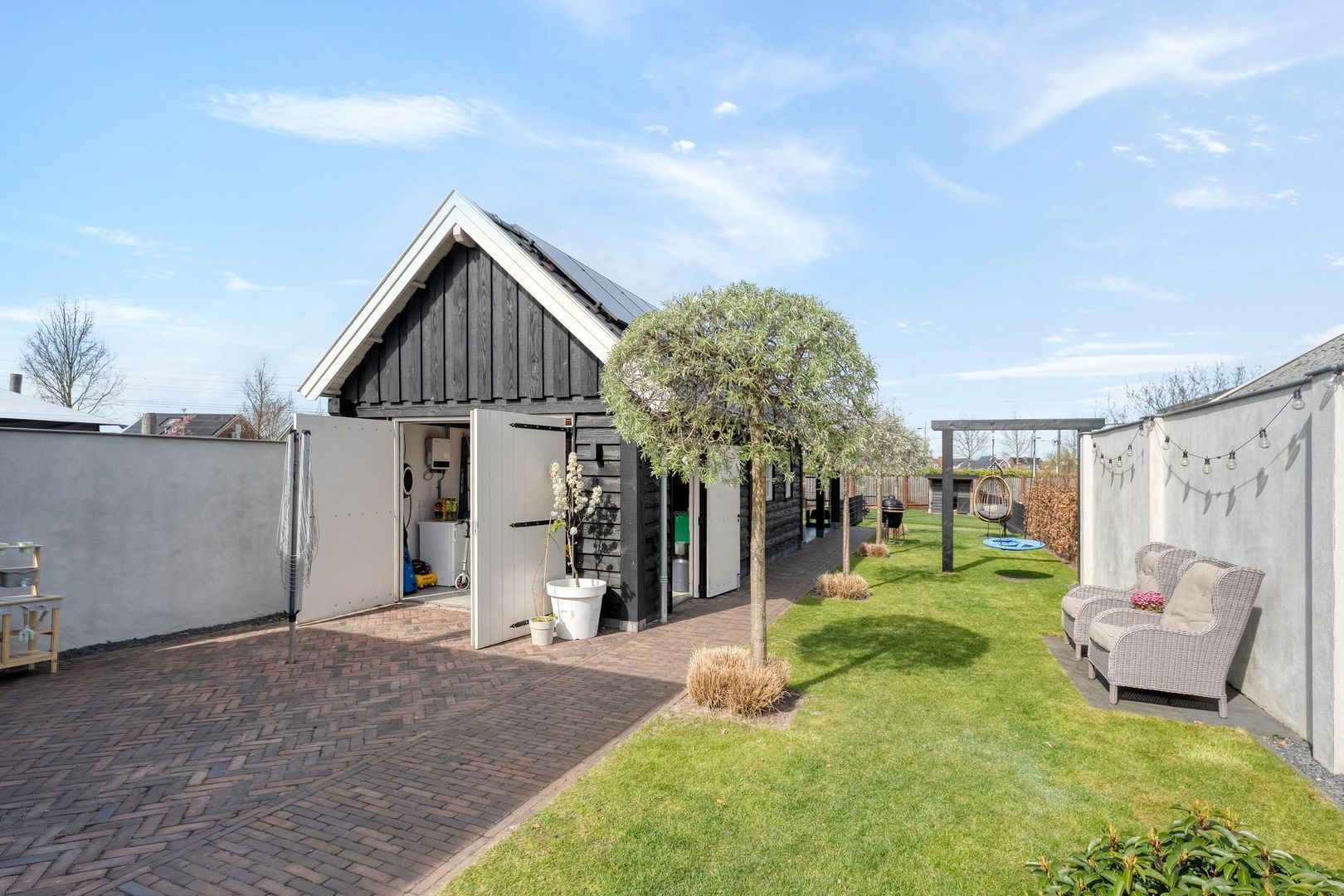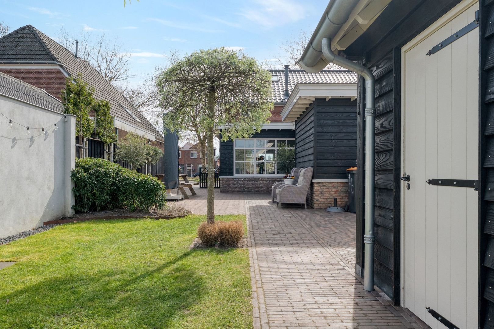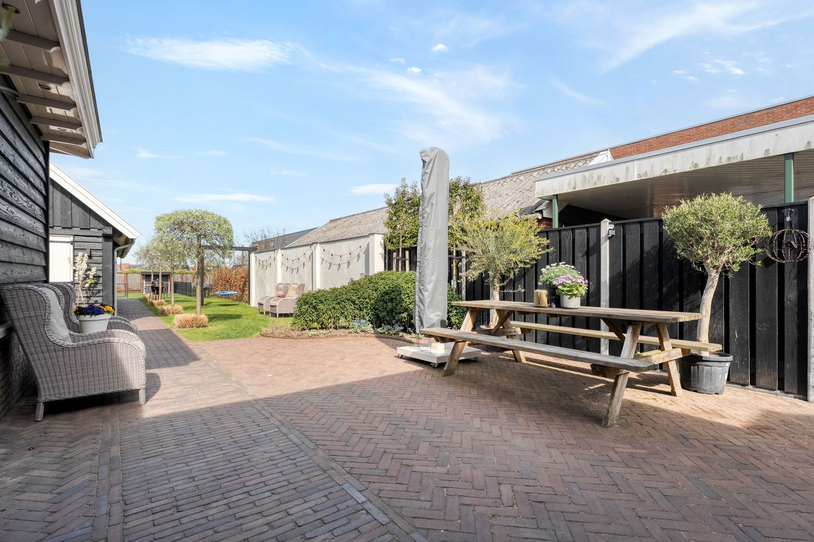 De achtertuin is bijzonder diep en biedt volop ruimte om te genieten van het buitenleven. Het grote terras biedt plek voor meerdere zitgedeeltes en dankzij de brede zij-ingang is de tuin goed bereikbaar.