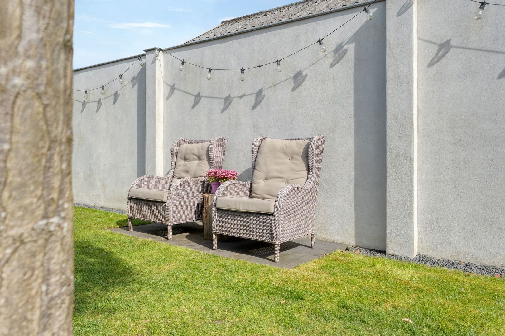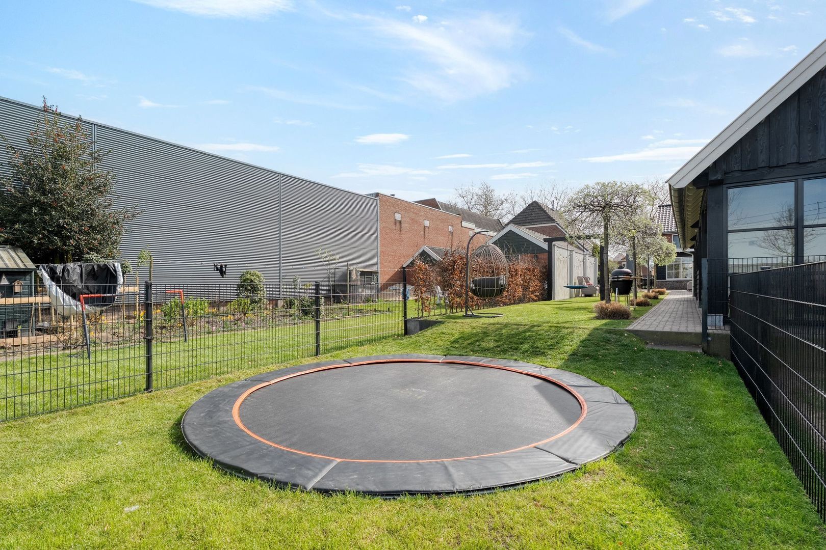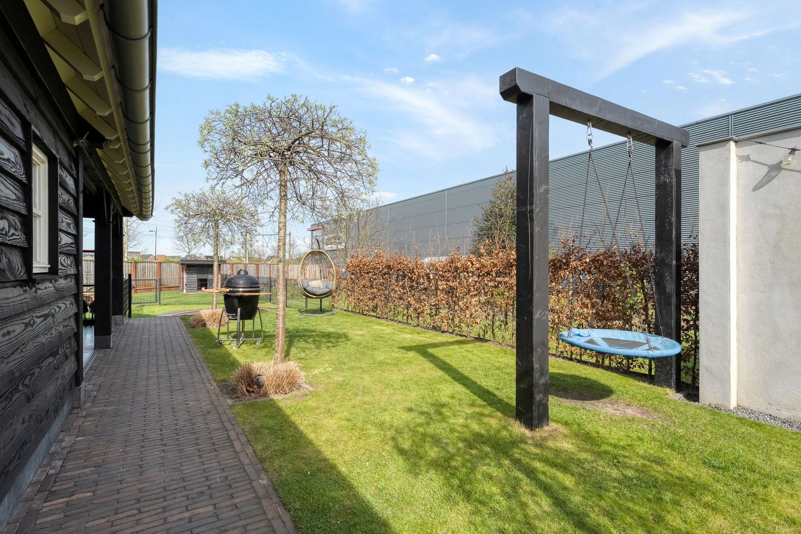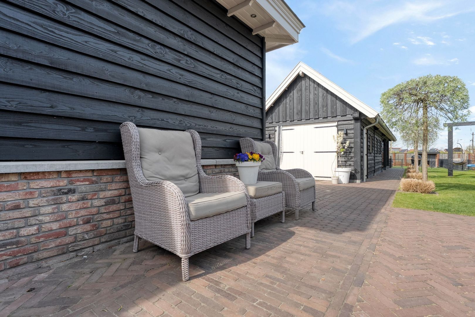 De achtertuin is bijzonder diep en biedt volop ruimte om te genieten van het buitenleven. Het grote terras biedt plek voor meerdere zitgedeeltes en dankzij de brede zij-ingang is de tuin goed bereikbaar.